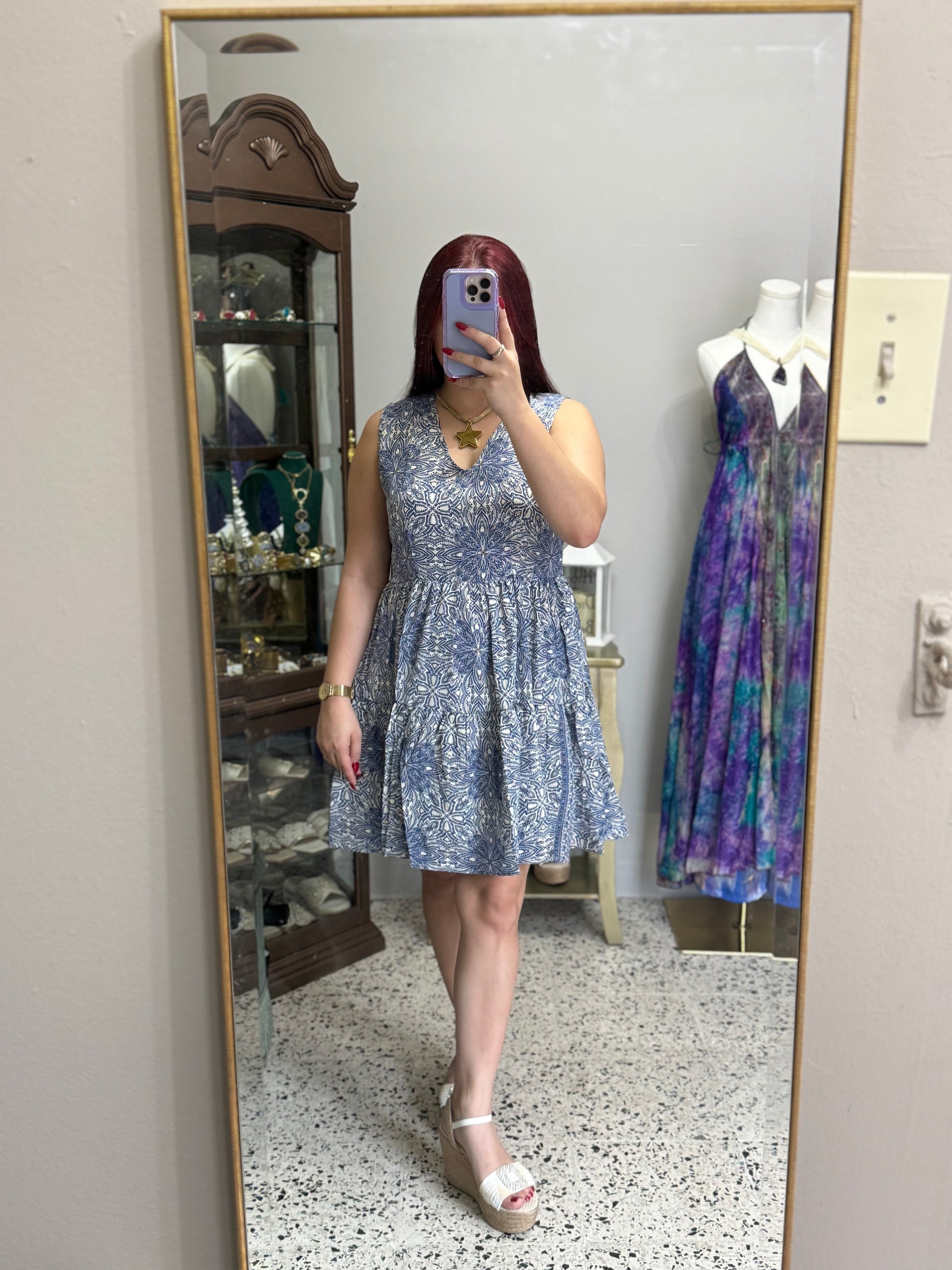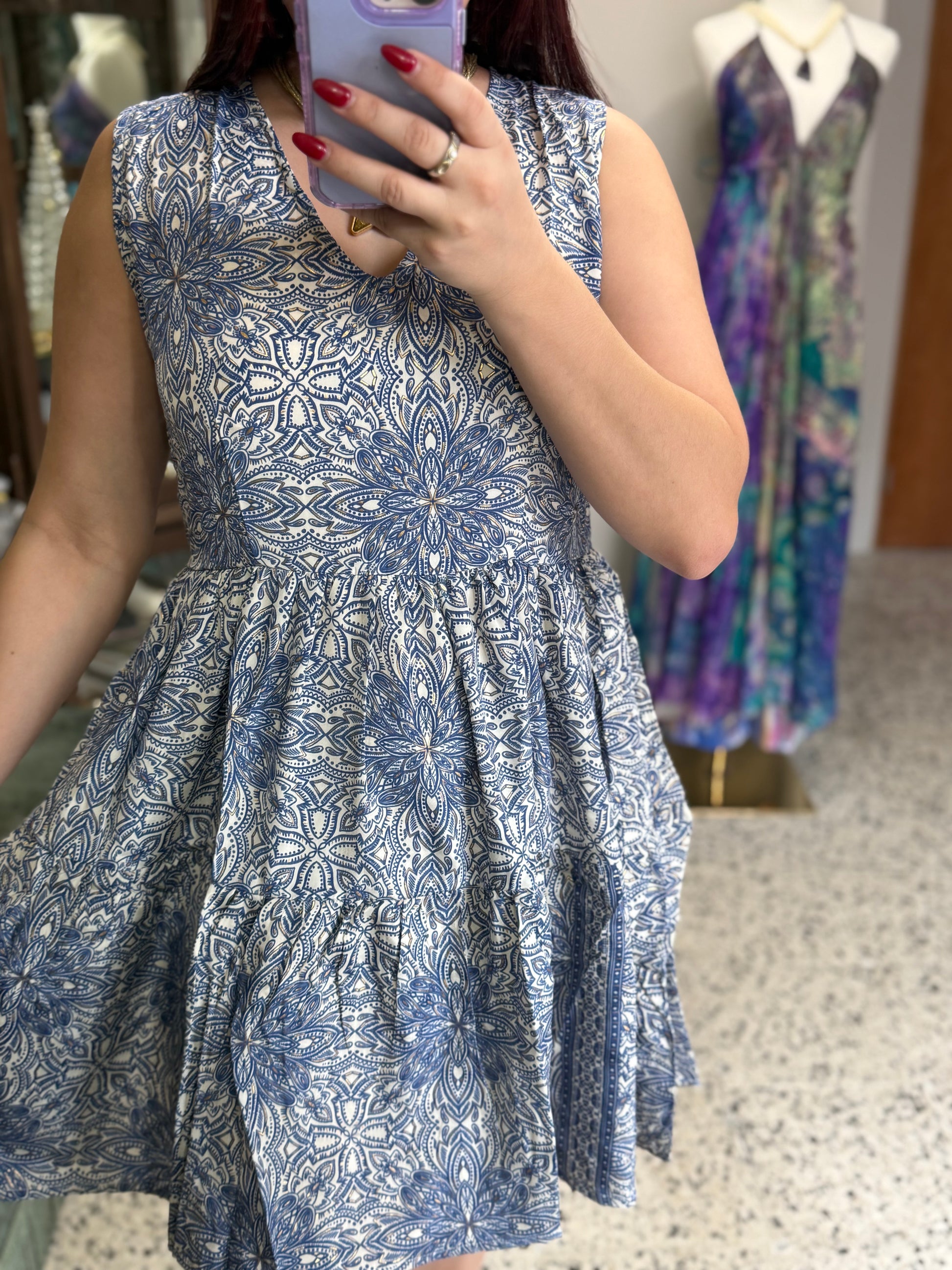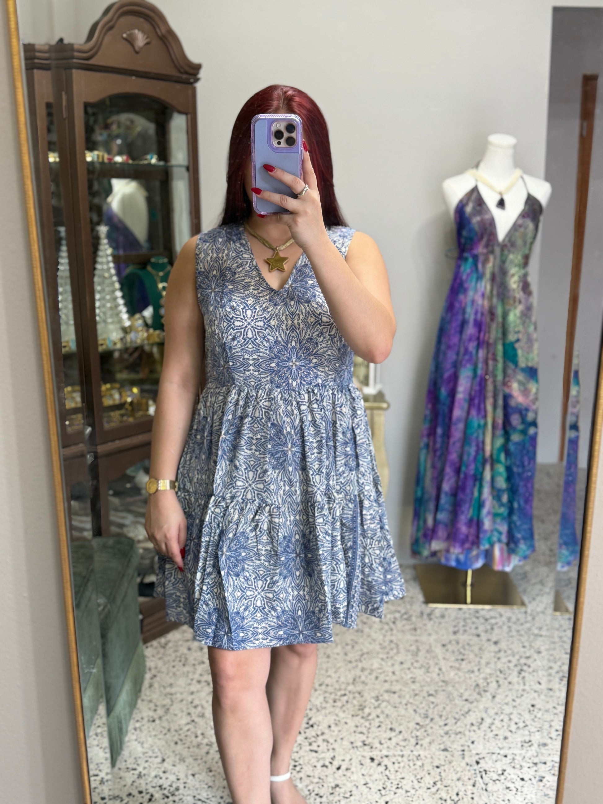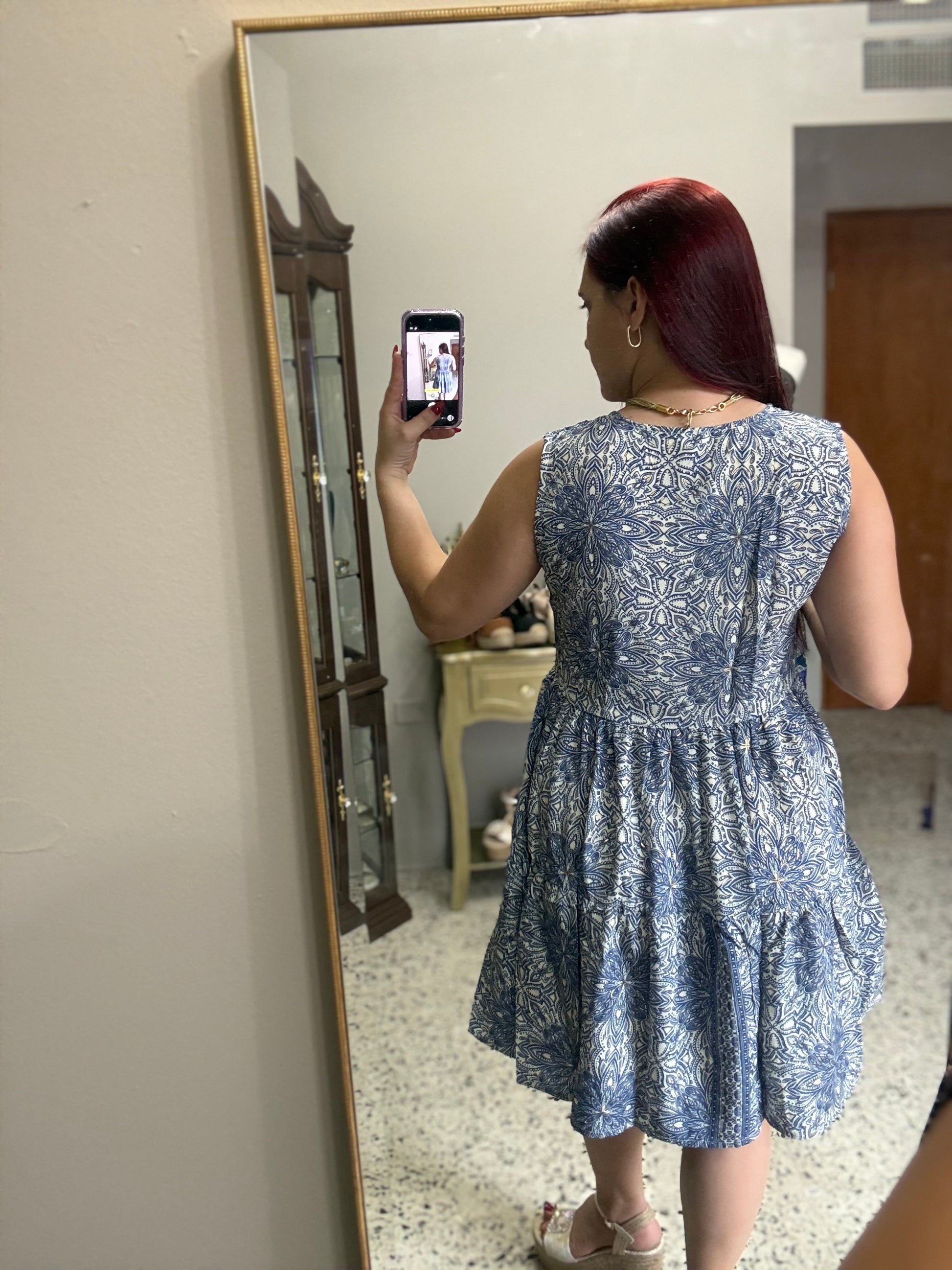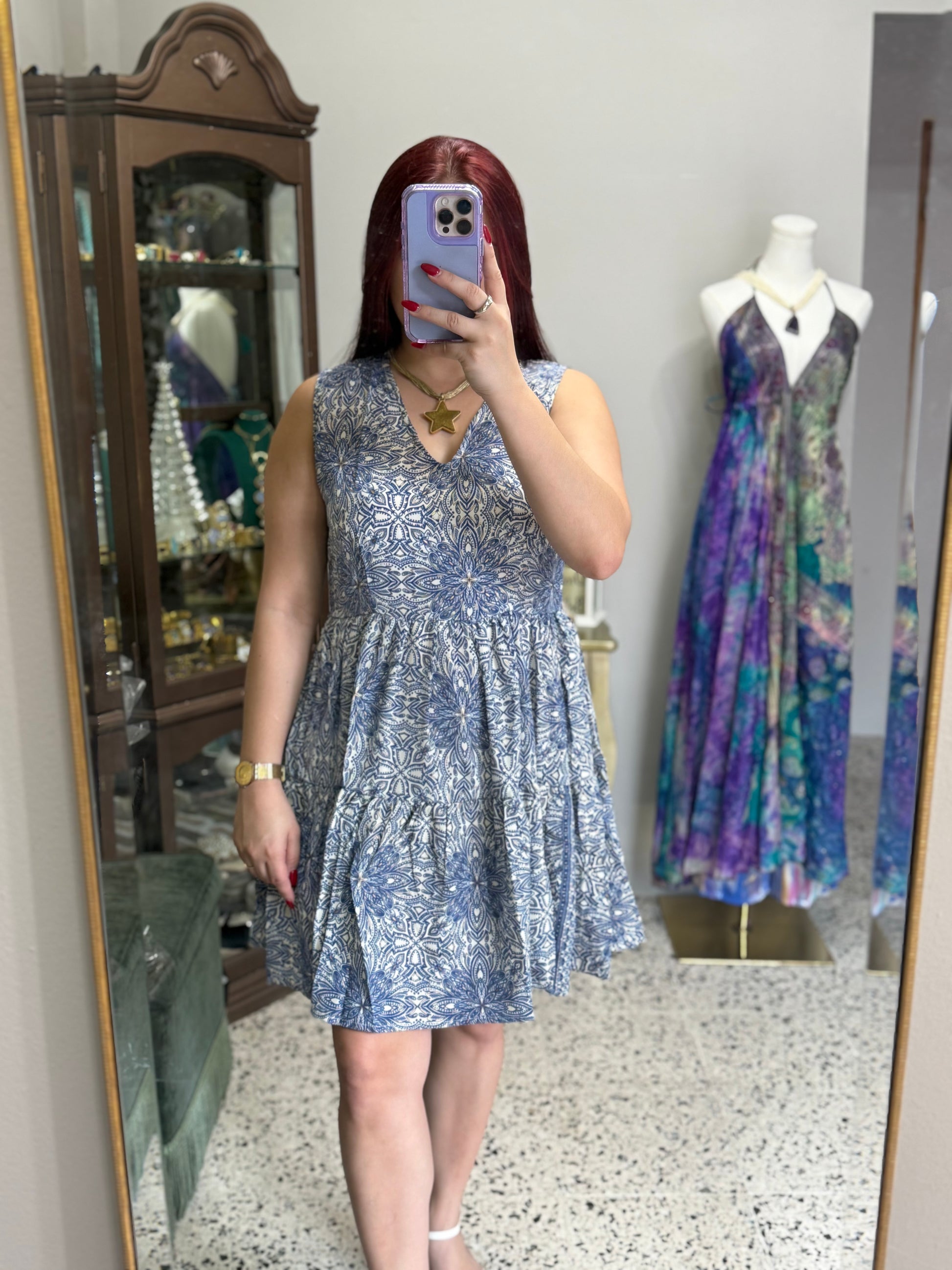Vestido corto con delicado estampado arabesco en tonos azul y blanco, diseñado para resaltar la figura con su corte en la cintura y falda con movimiento. Su escote en V y tela ligera lo hacen perfecto para un look fresco, femenino y elegante, ideal para el día o una ocasión especial casual