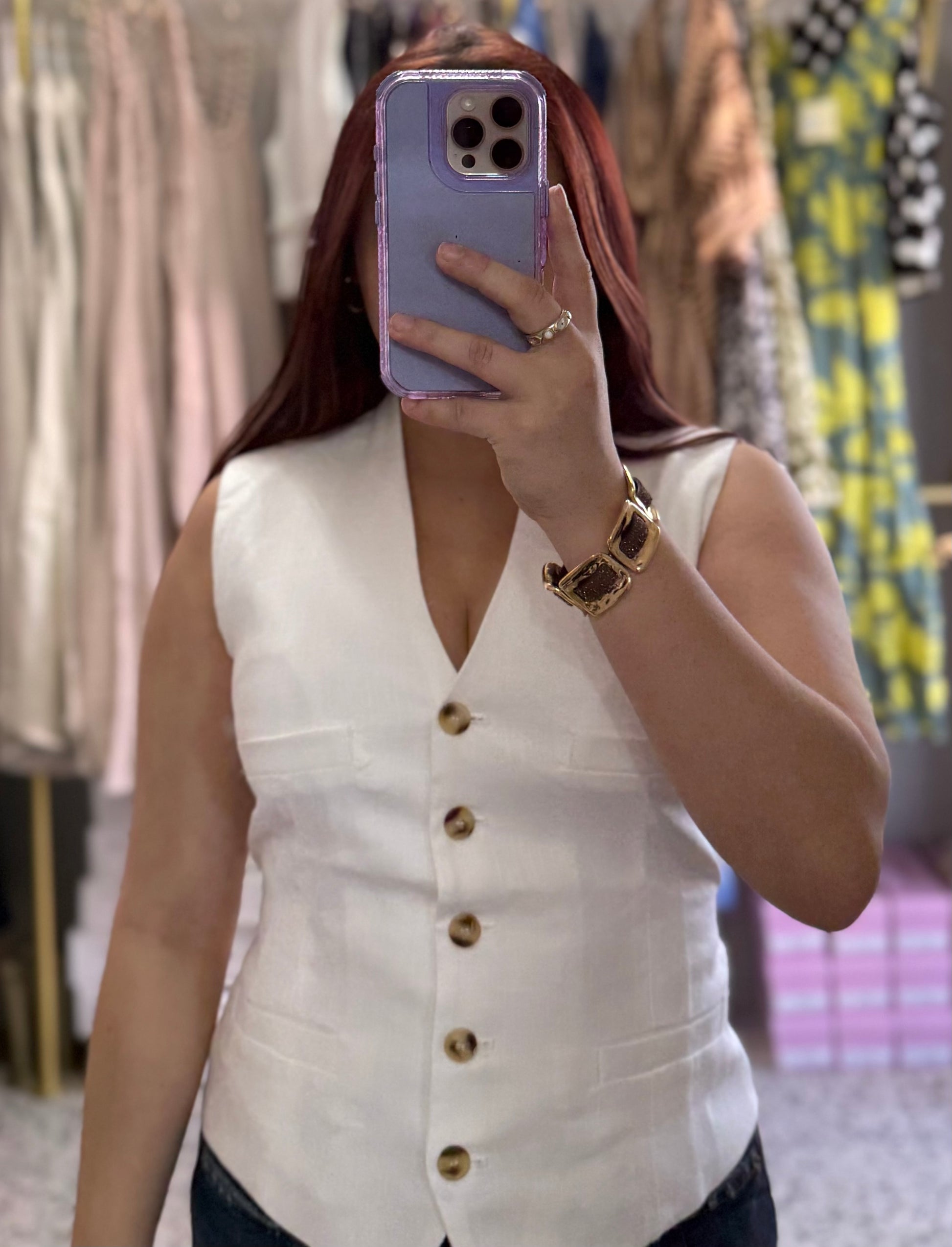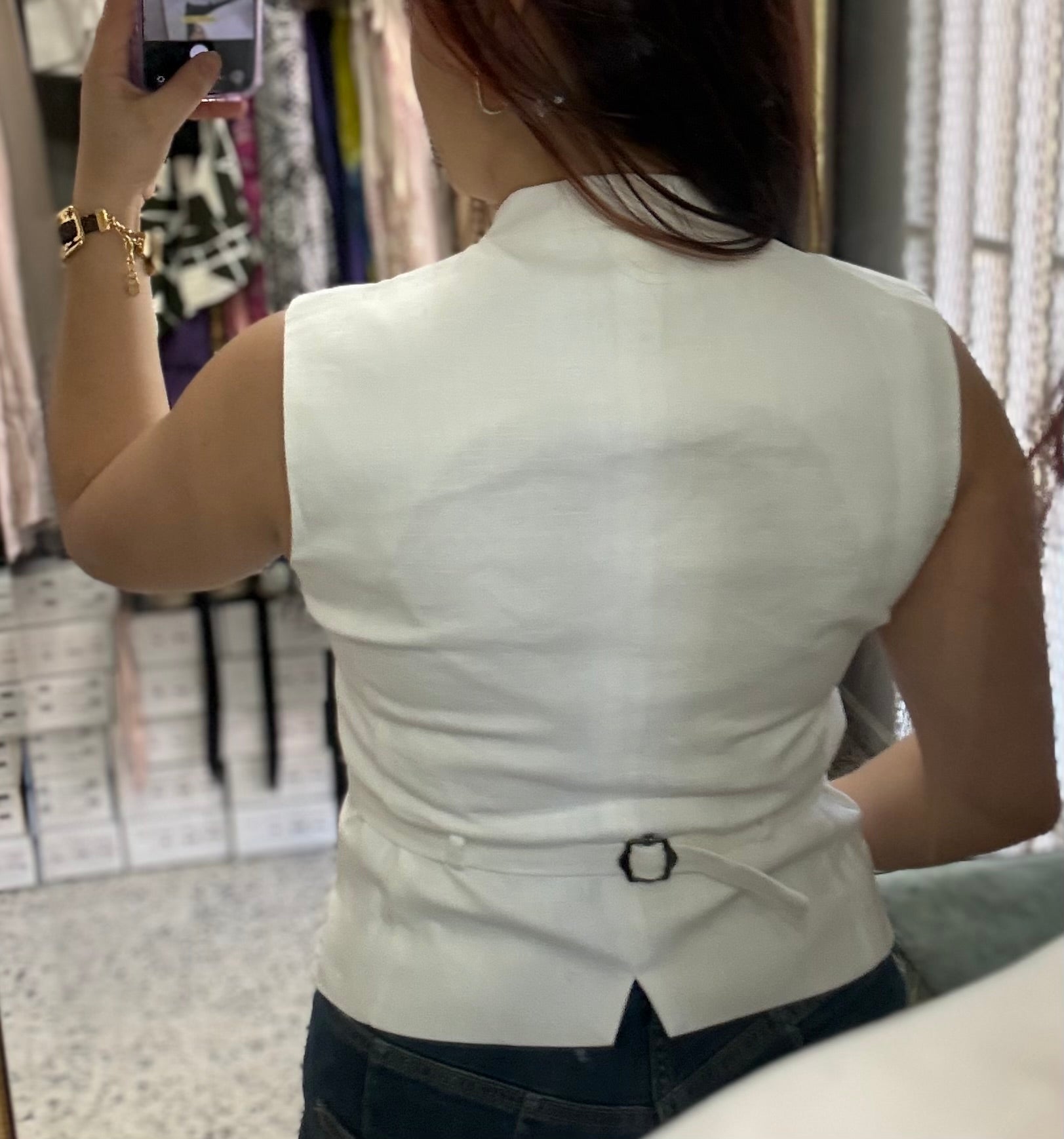 Chaleco en tono marfil con botones frontales y cinturón ajustable que realza la figura de forma elegante y estructurada. Su diseño sin mangas lo convierte en una pieza versátil ideal para looks formales o casuales con estilo boutique.