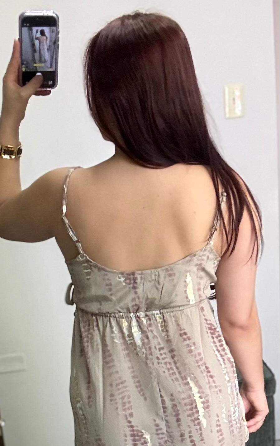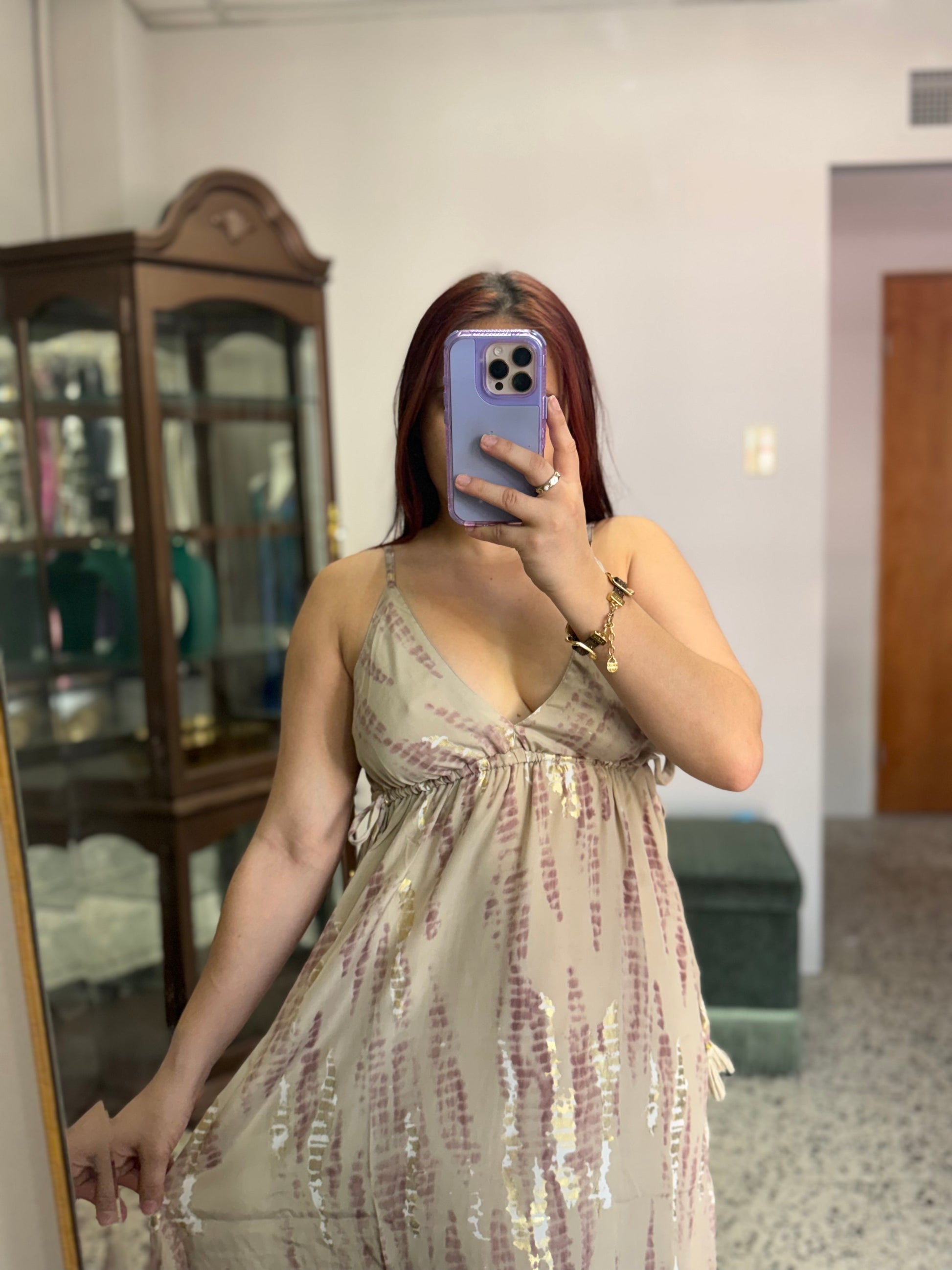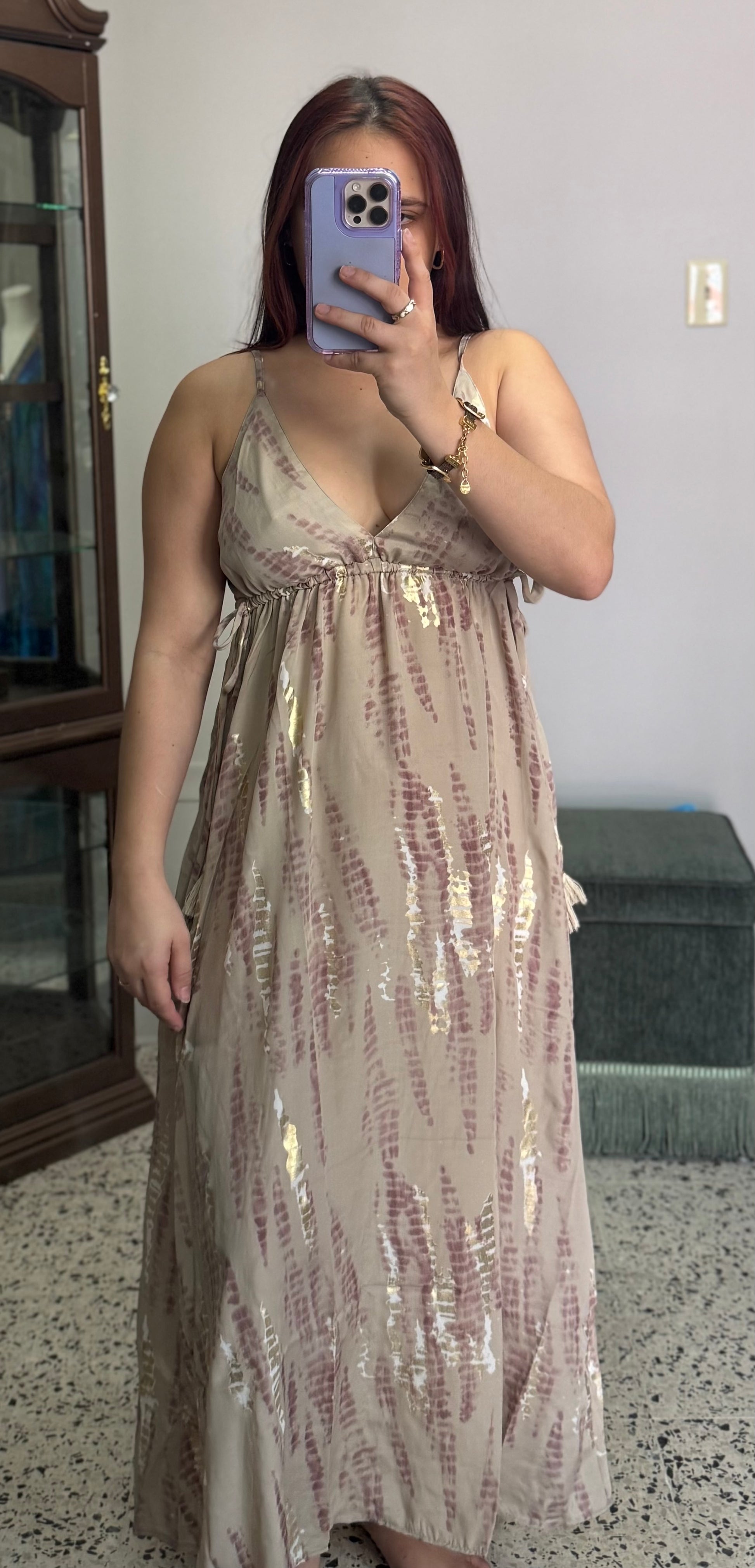 Vestido largo en tono arena con destellos sutiles que aportan un brillo elegante y femenino. Su escote en V y cintura ajustable estilizan la figura mientras su caída ligera brinda movimiento y frescura en cada paso.