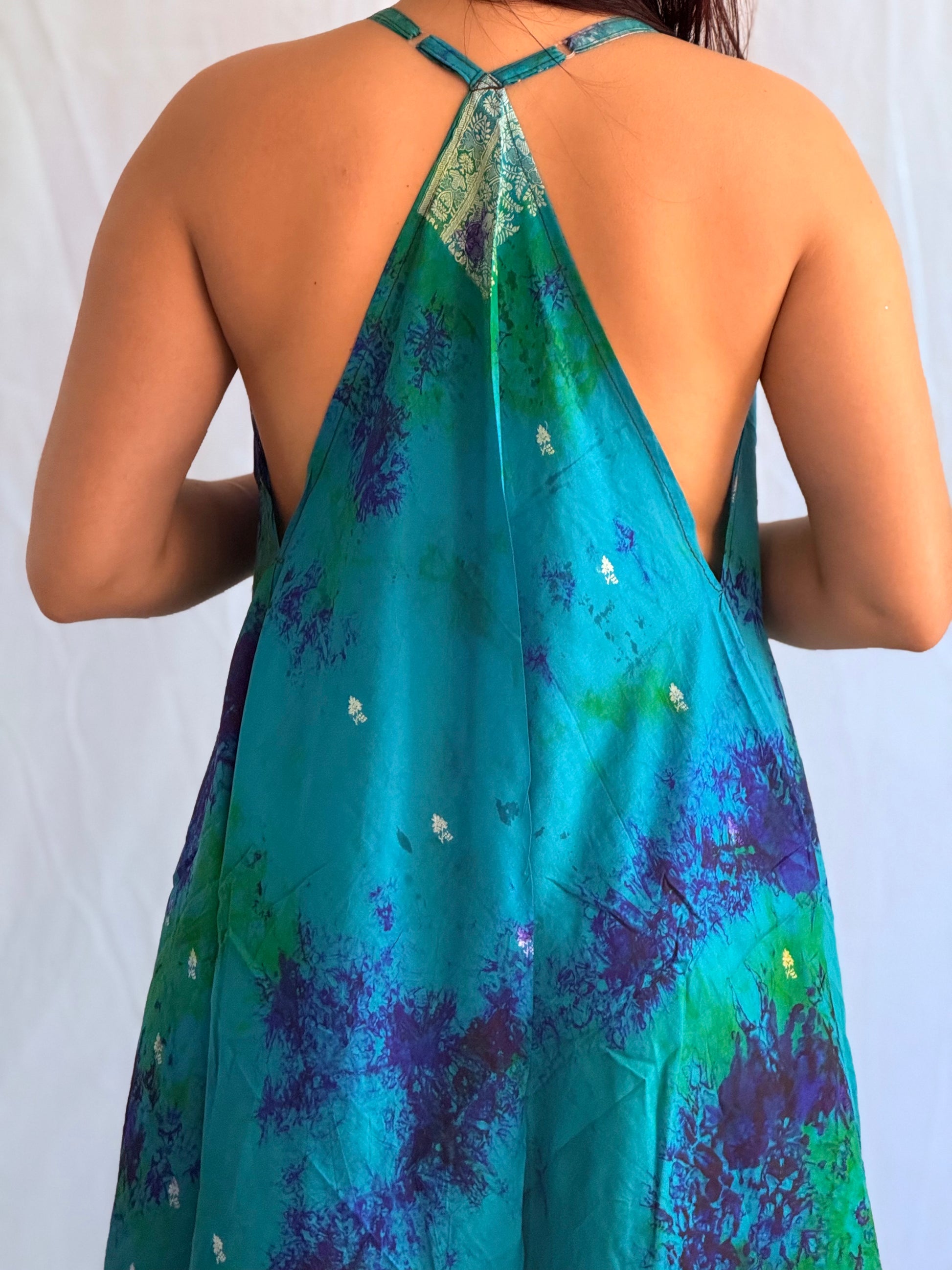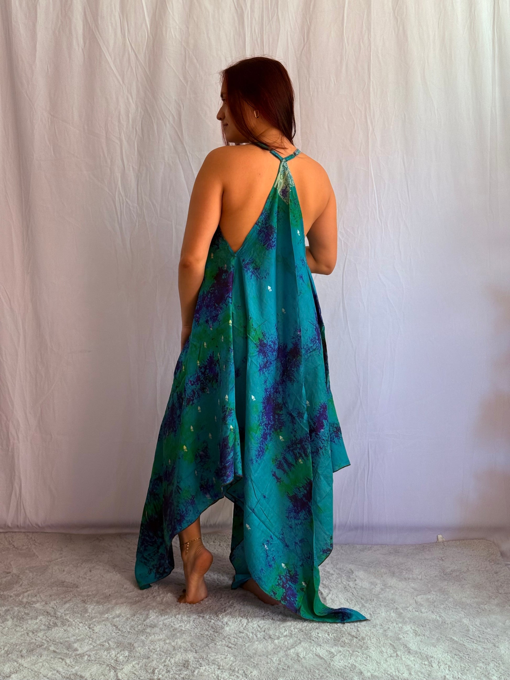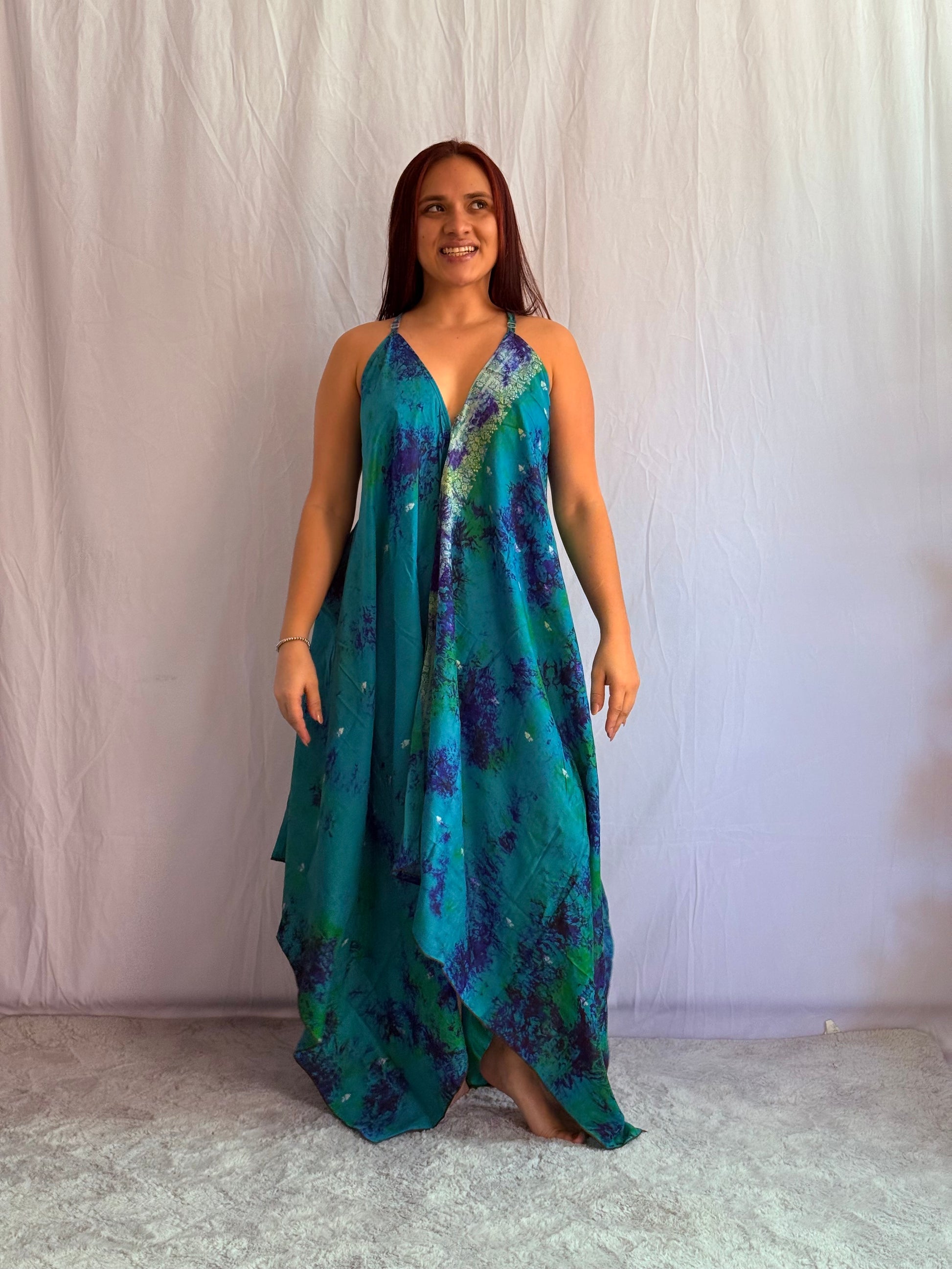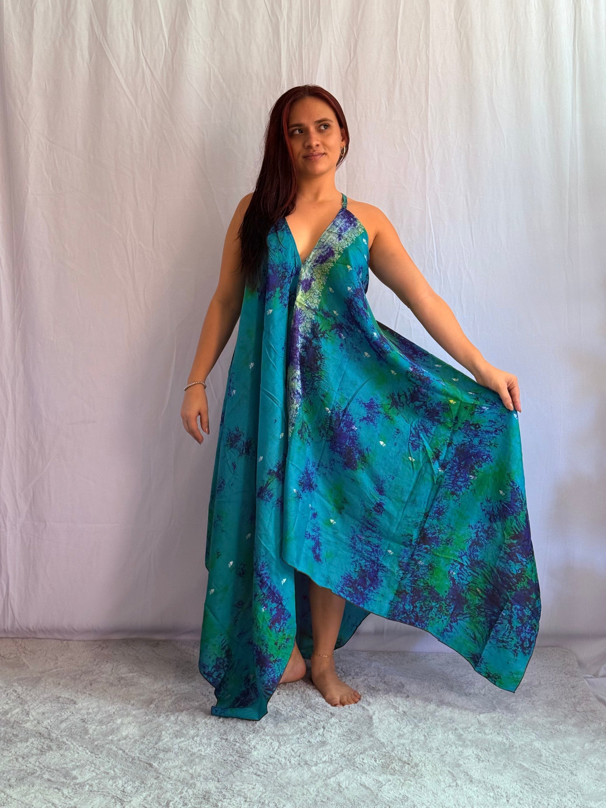 Asymmetrical one size dress with pointed hem, crafted from 100% rayon in India. Its flowy and lightweight design adapts to different body types, offering comfort and effortless style for both day and night looks.