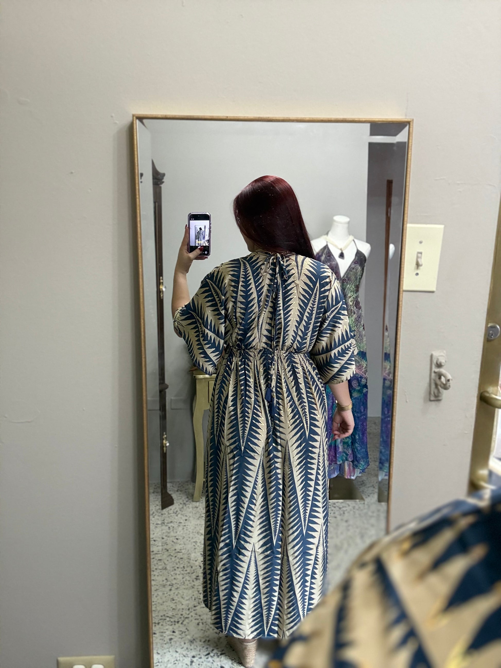Vestido largo con estampado botánico geométrico en tonos azul profundo y crema. Su escote en V, cintura elástica y mangas sueltas crean una silueta fluida y favorecedora, ideal para un look sofisticado y fresco. Perfecto para eventos casuales elegantes, vacaciones o una salida especial con estilo natural.