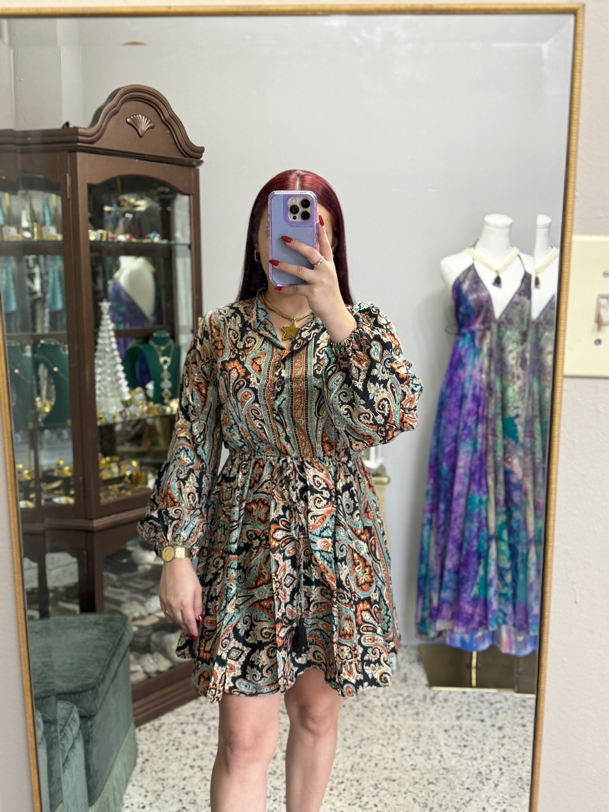 Vestido corto de manga larga con hermoso estampado bohemio en tonos verde jade, terracota y dorado. Su diseño con cuello alto, cintura ajustable y falda fluida crea una silueta femenina y elegante, ideal para lucir sofisticada sin esfuerzo. Perfecto para eventos casuales, brunch o una salida especial donde quieras destacar con estilo.
