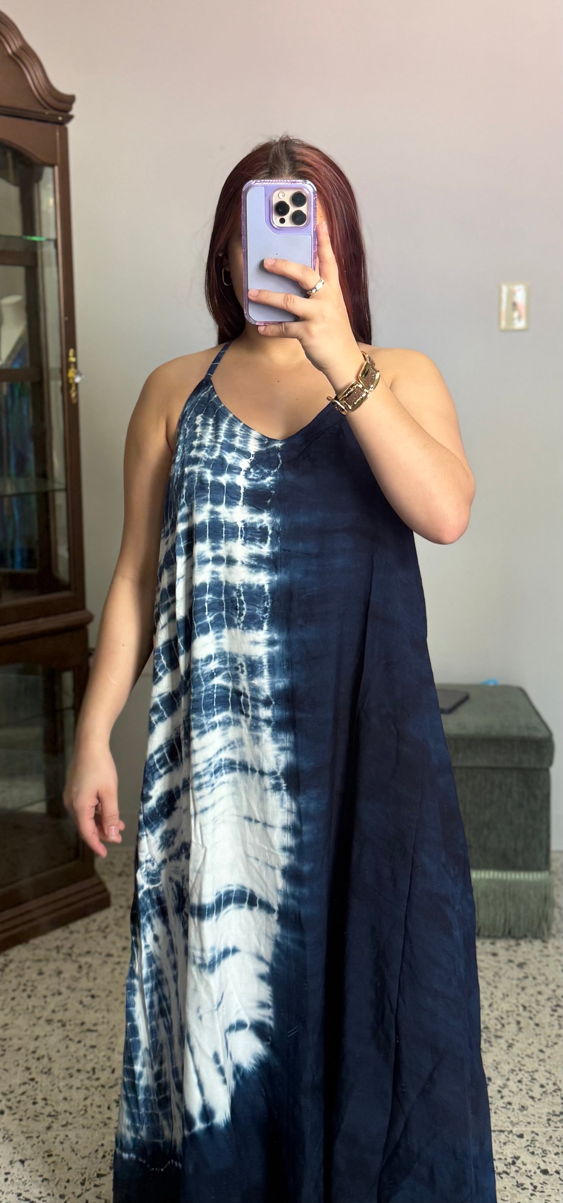 Vestido largo en tonos azul marino con diseño tie-dye que aporta un estilo fresco y sofisticado. Su espalda con tirantes delicados y silueta fluida lo convierten en una pieza perfecta para días de verano o noches especiales.