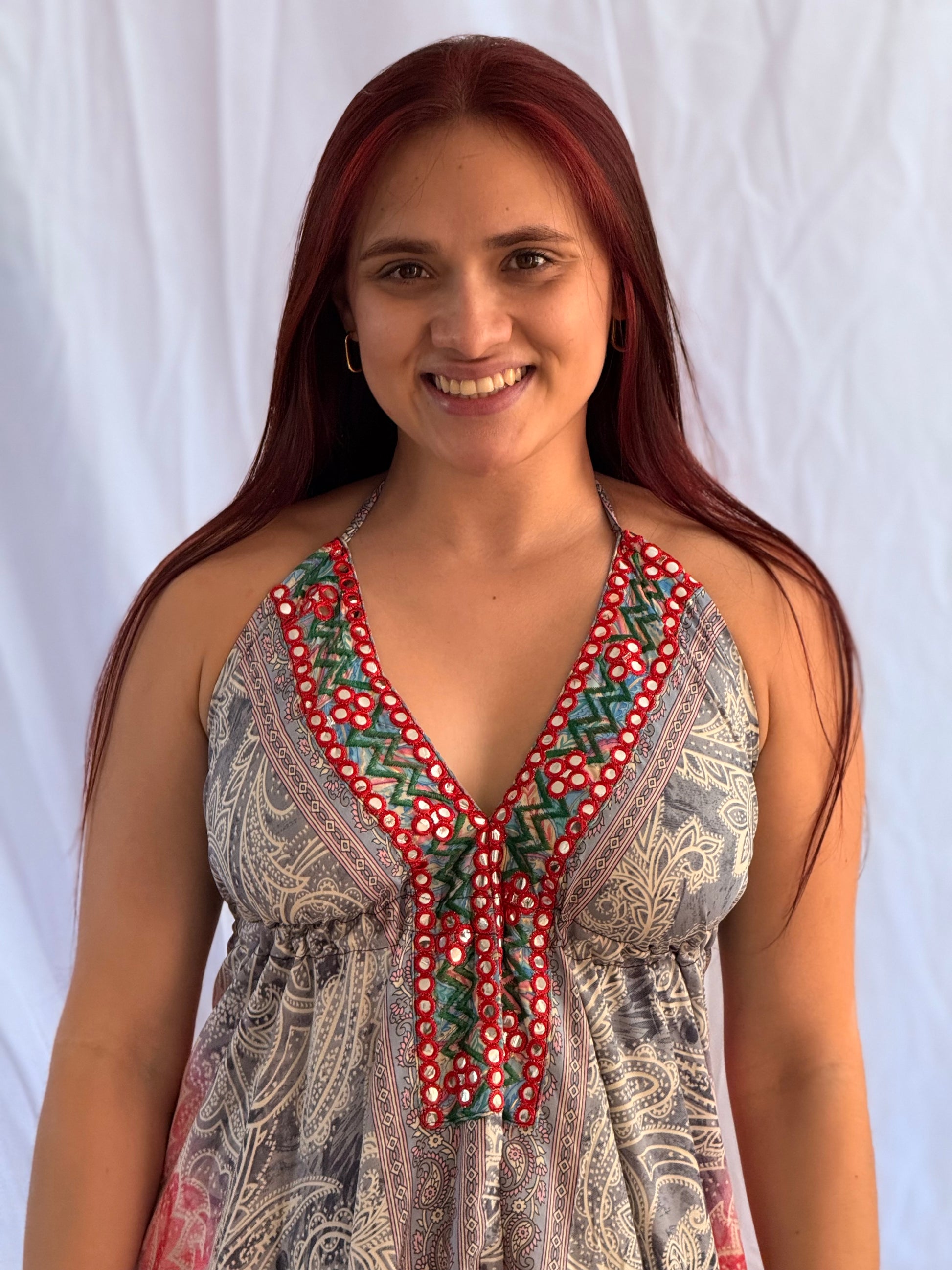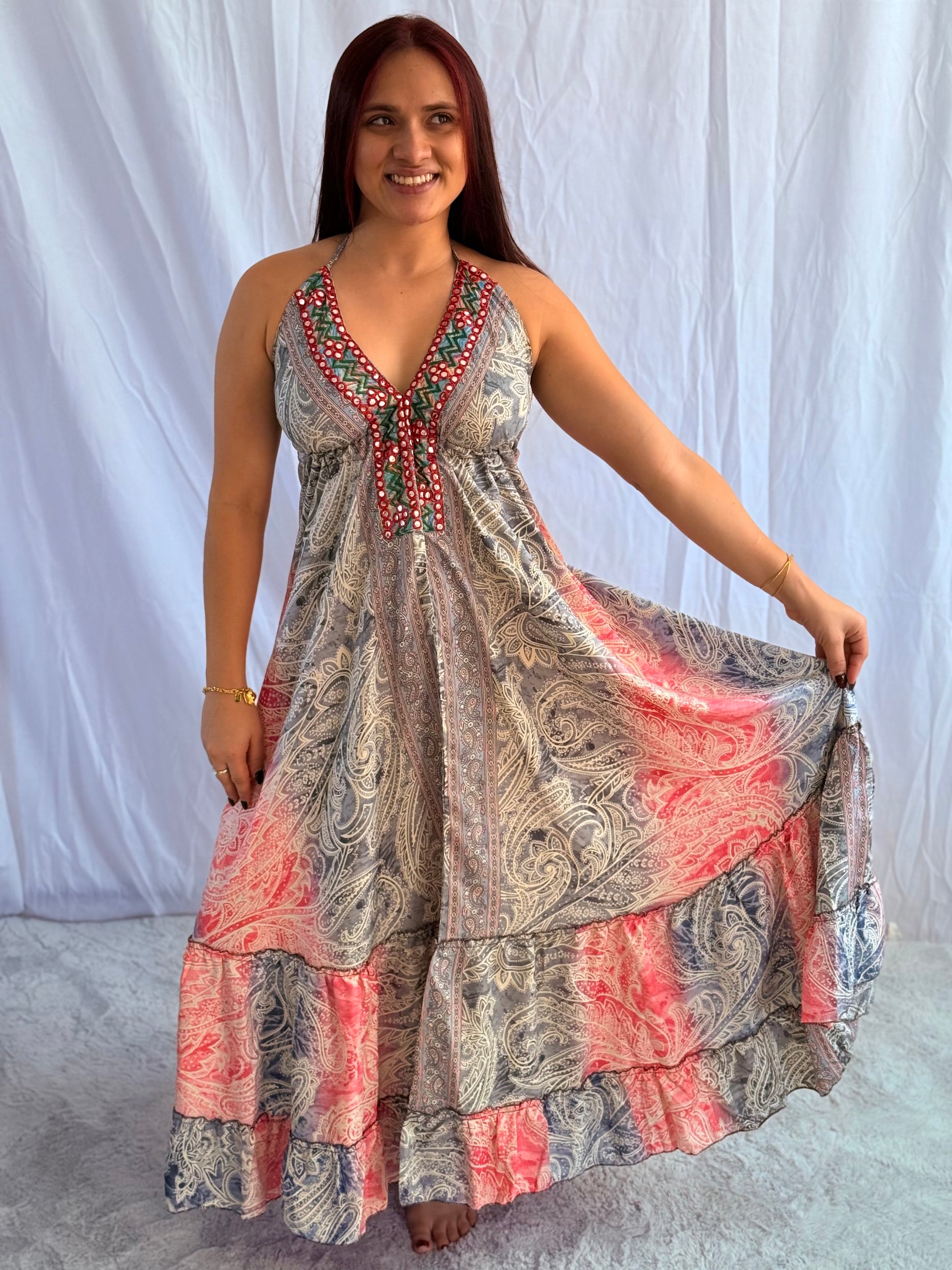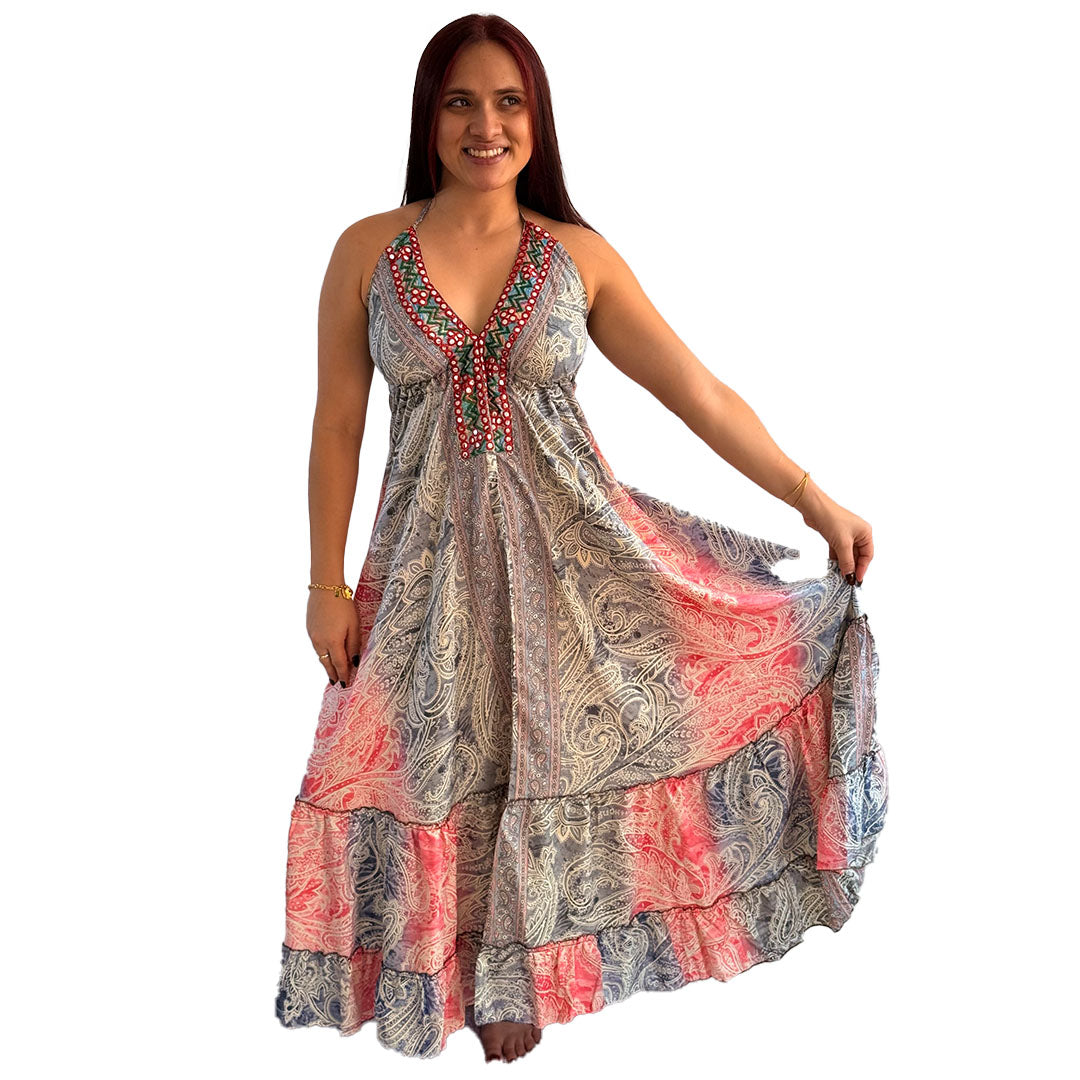 Un vestido único lleno de color y energía. Su diseño con amarre al cuello y espalda descubierta resalta la silueta femenina mientras brinda frescura y comodidad. El estampado multicolor con detalles bordados y apliques brillantes lo convierte en una pieza llamativa y sofisticada.