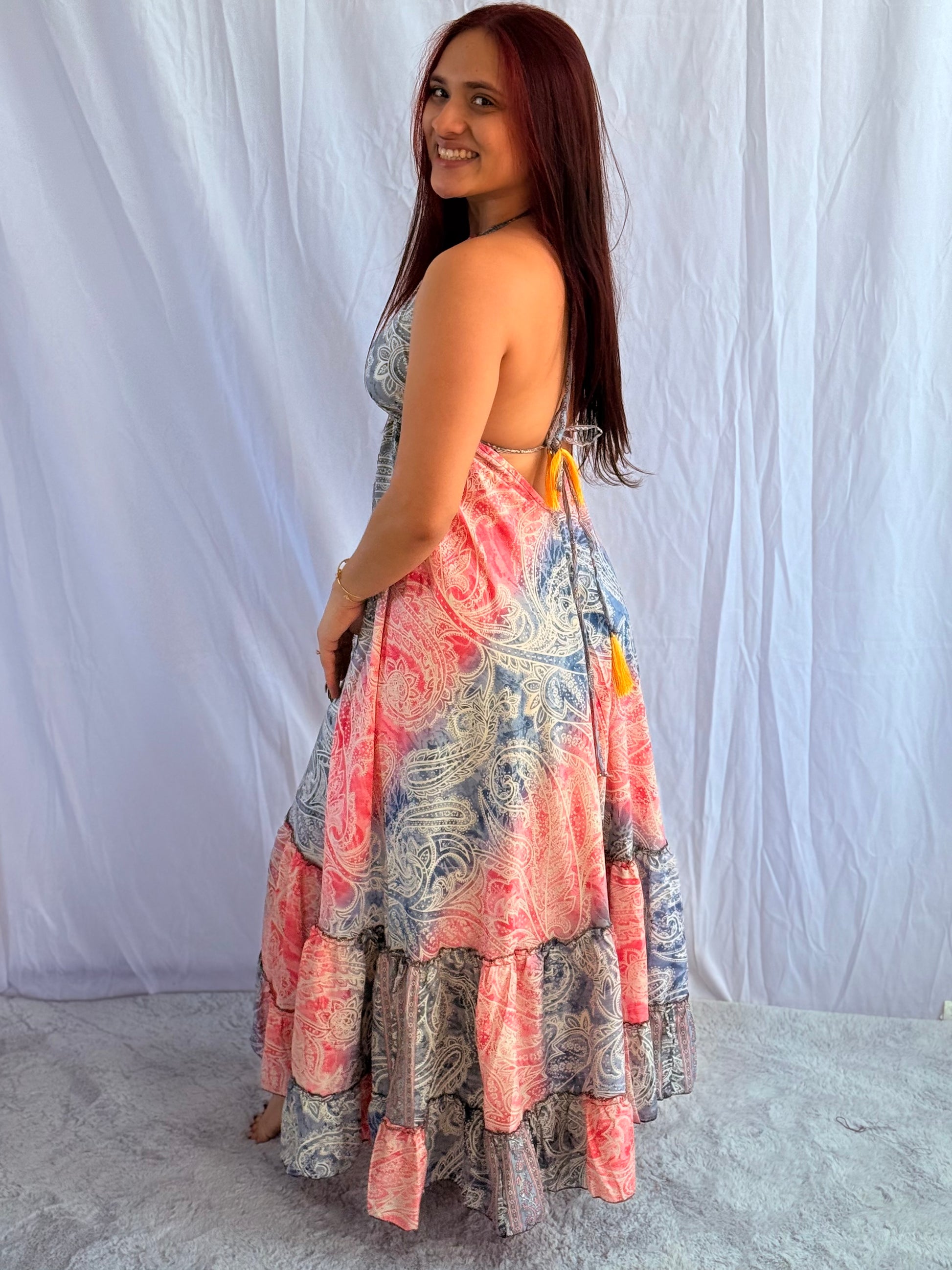 A one-of-a-kind dress full of vibrant colors and energy. Designed with a halter neckline and open back, it enhances the feminine silhouette while offering freshness and comfort. The multicolor print with embroidered details and shiny accents makes it a truly eye-catching and sophisticated piece.