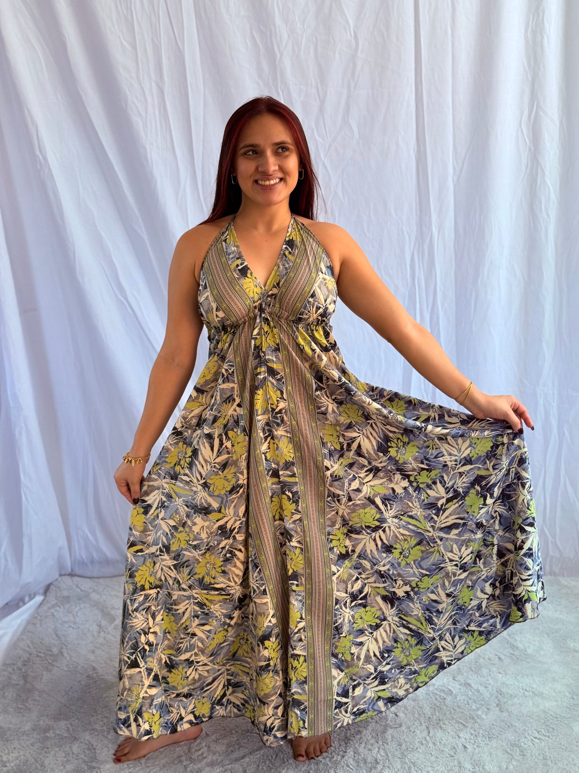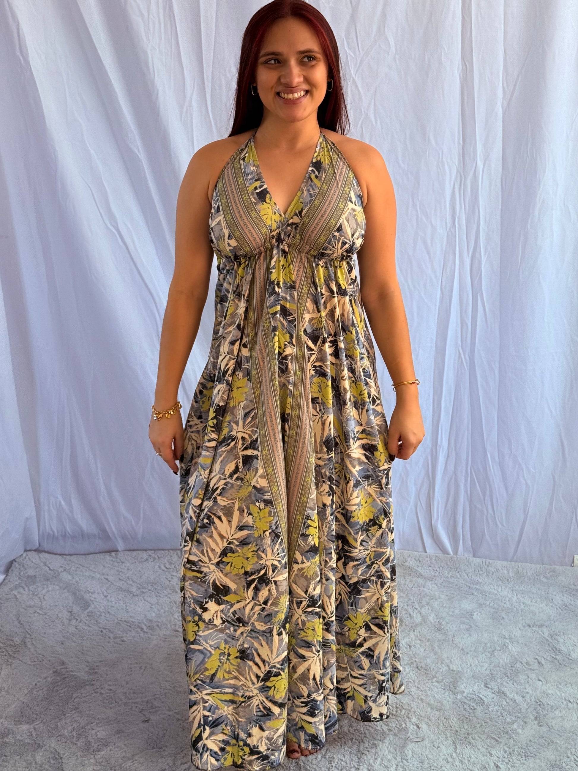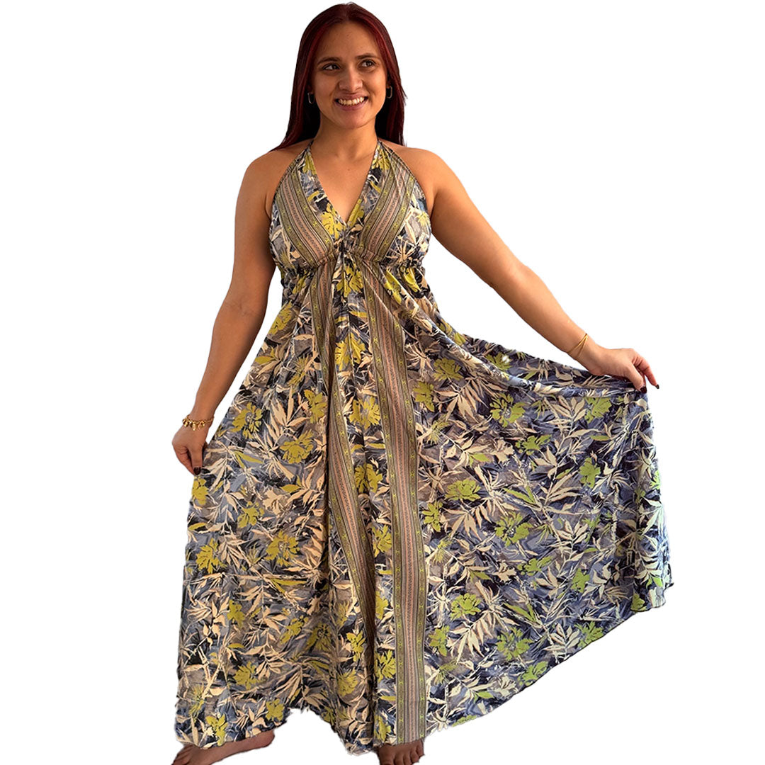 Un vestido único lleno de color y energía. Su diseño con amarre al cuello y espalda descubierta resalta la silueta femenina mientras brinda frescura y comodidad. El estampado multicolor con detalles bordados y apliques brillantes lo convierte en una pieza llamativa y sofisticada.