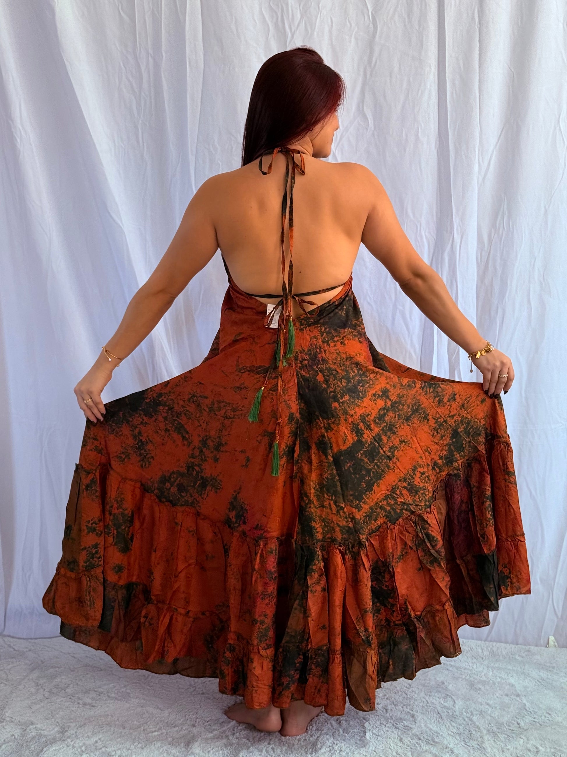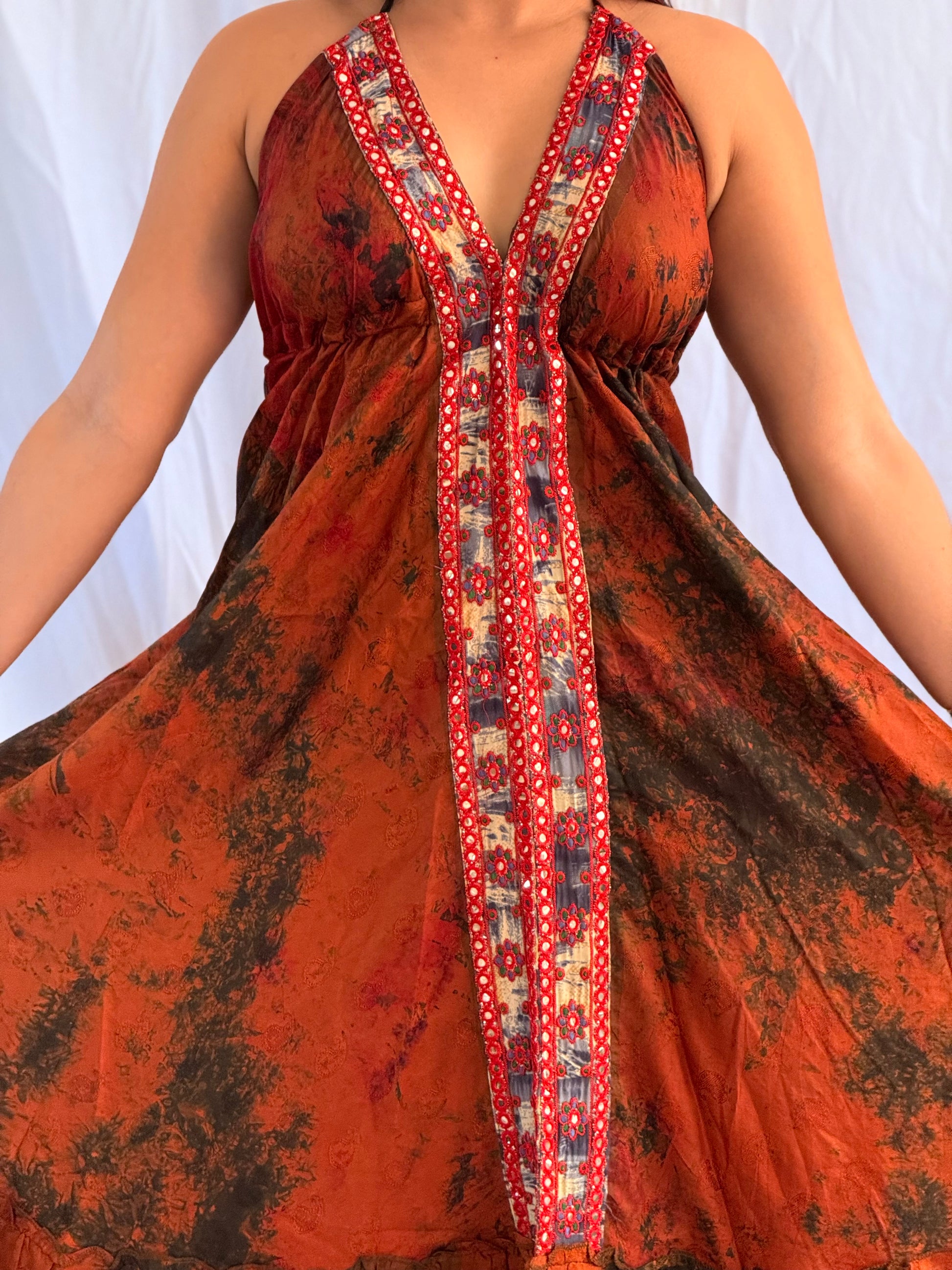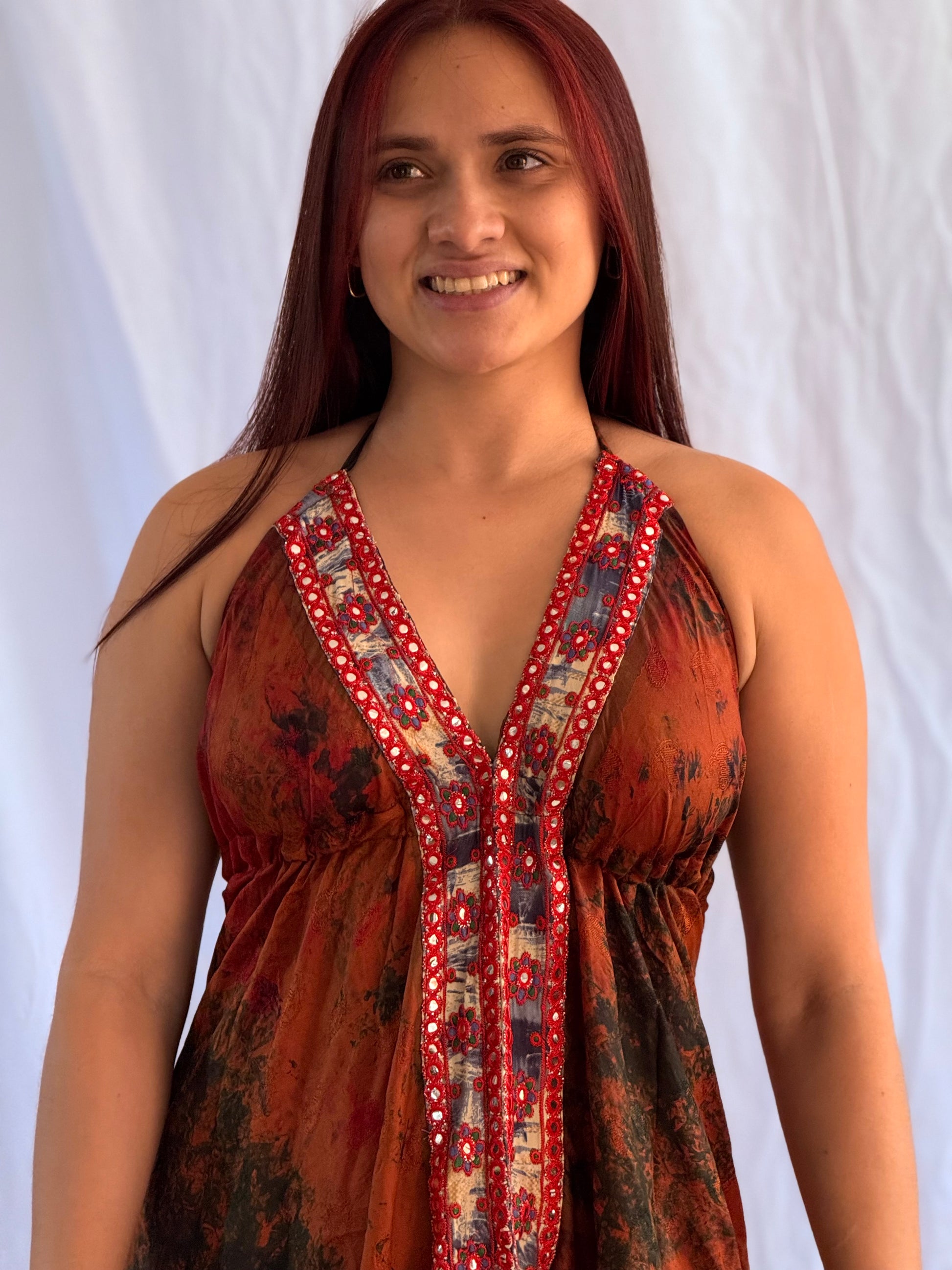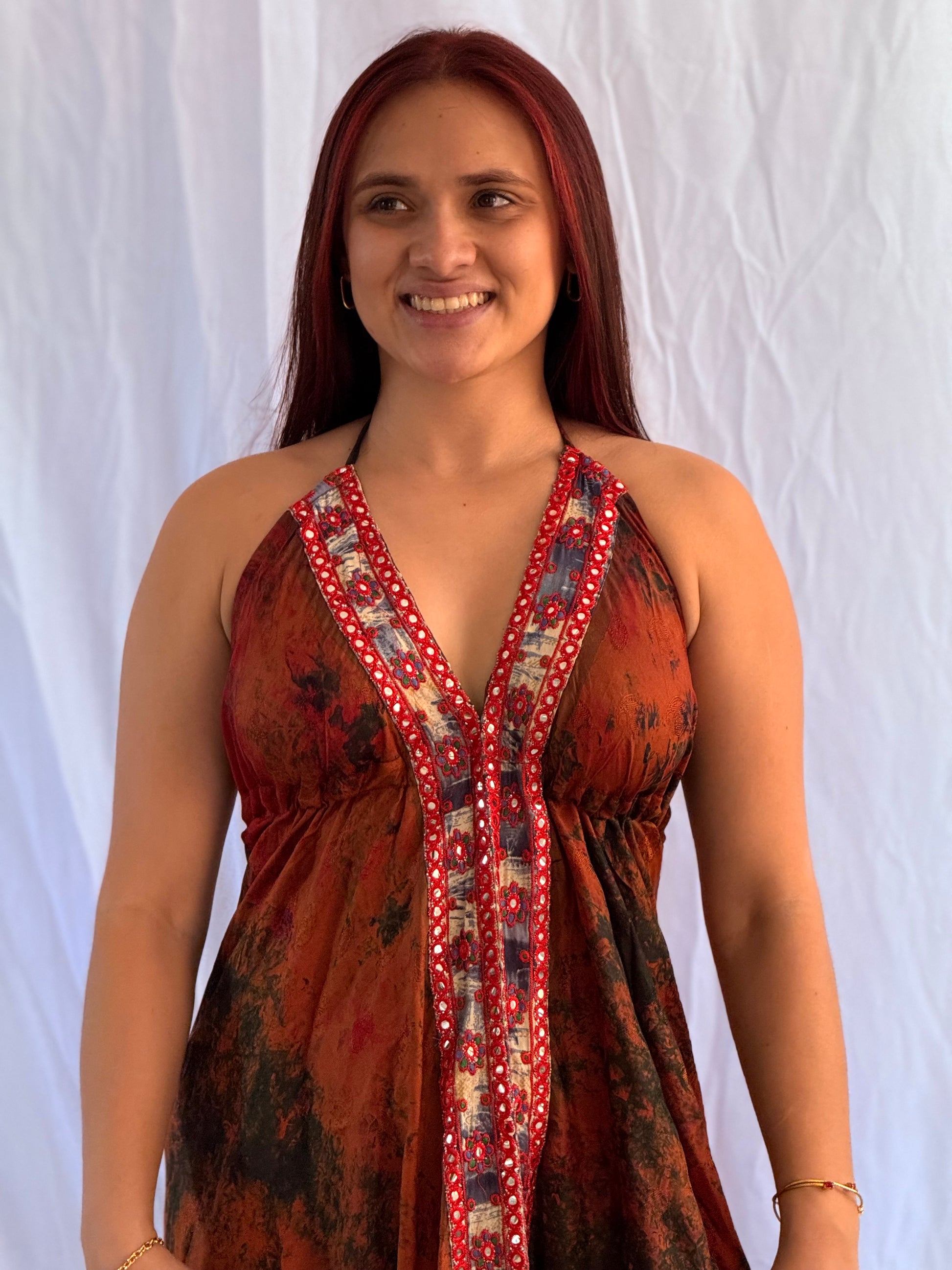 A one-of-a-kind dress full of vibrant colors and energy. Designed with a halter neckline and open back, it enhances the feminine silhouette while offering freshness and comfort. The multicolor print with embroidered details and shiny accents makes it a truly eye-catching and sophisticated piece.