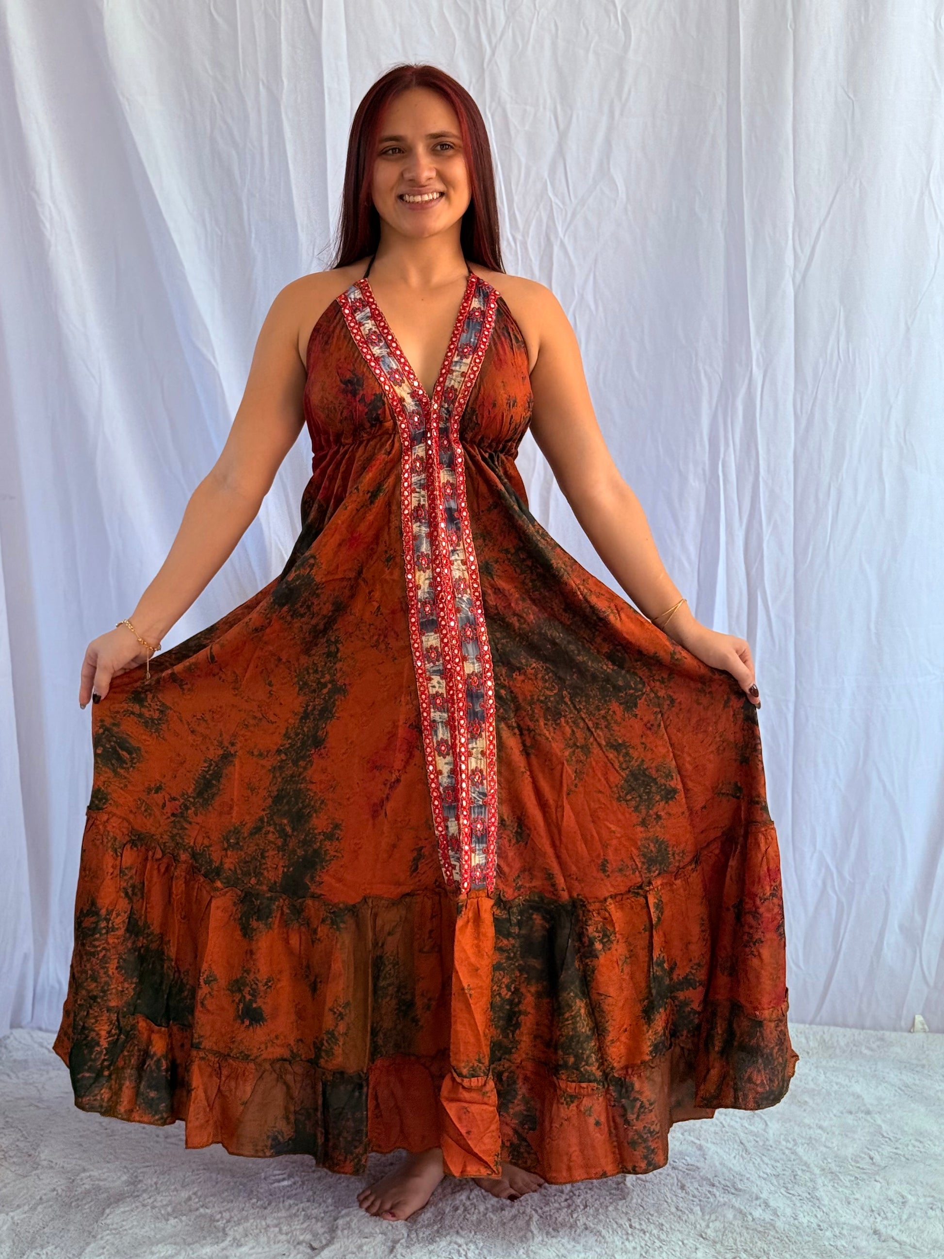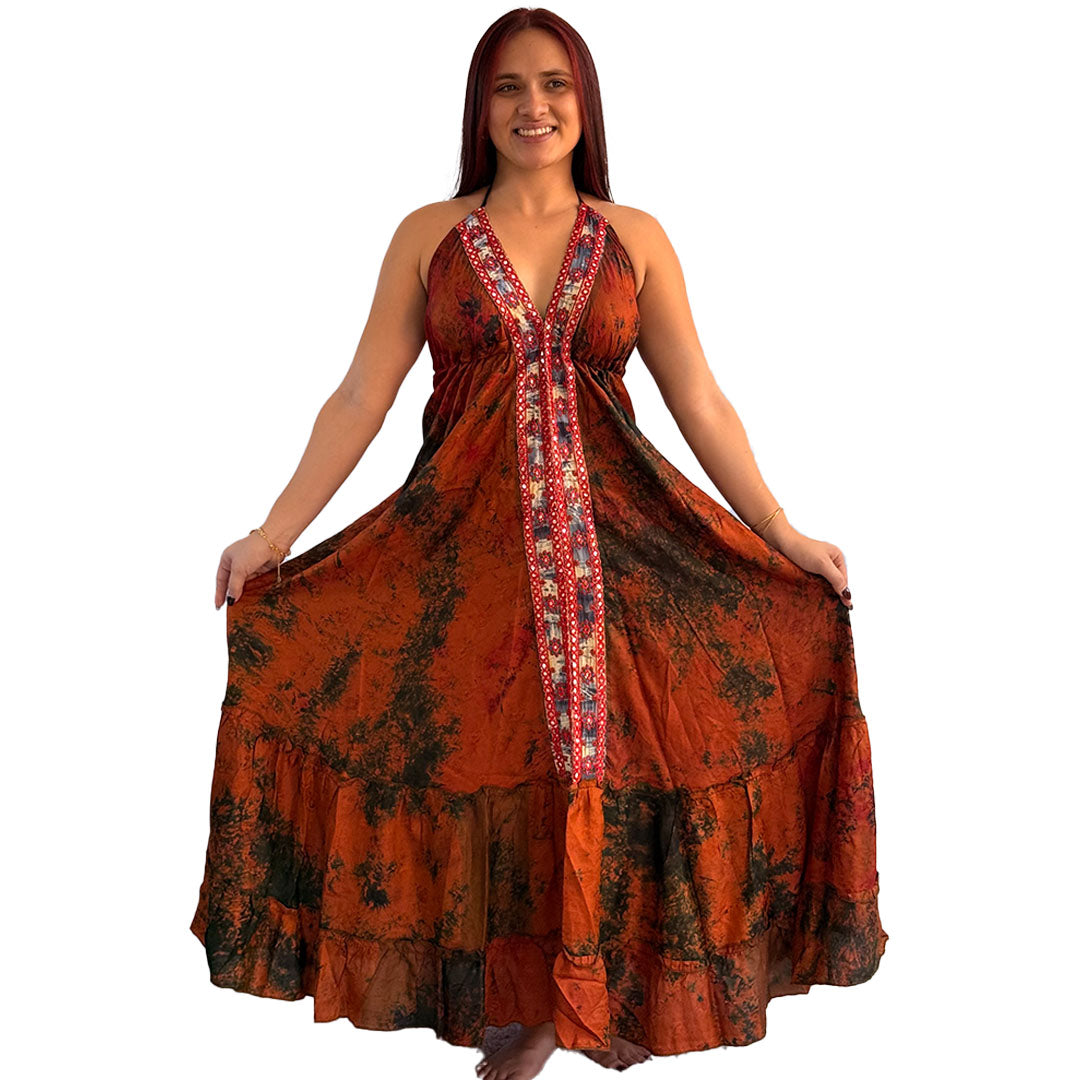 Un vestido único lleno de color y energía. Su diseño con amarre al cuello y espalda descubierta resalta la silueta femenina mientras brinda frescura y comodidad. El estampado multicolor con detalles bordados y apliques brillantes lo convierte en una pieza llamativa y sofisticada.