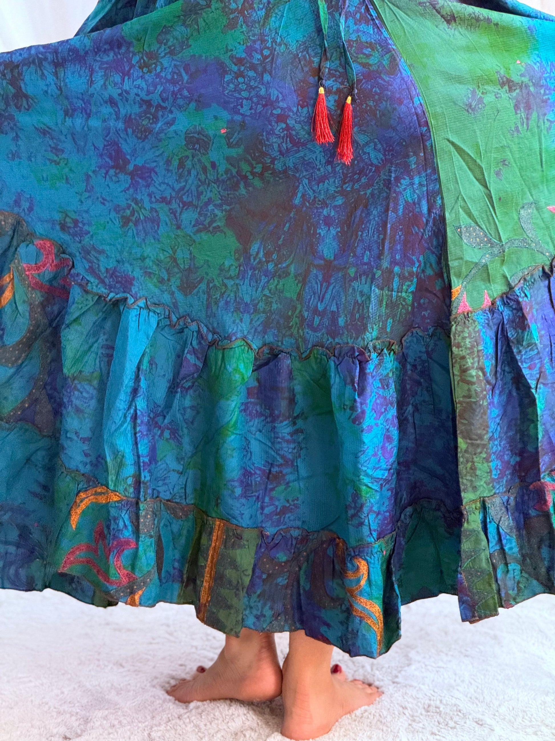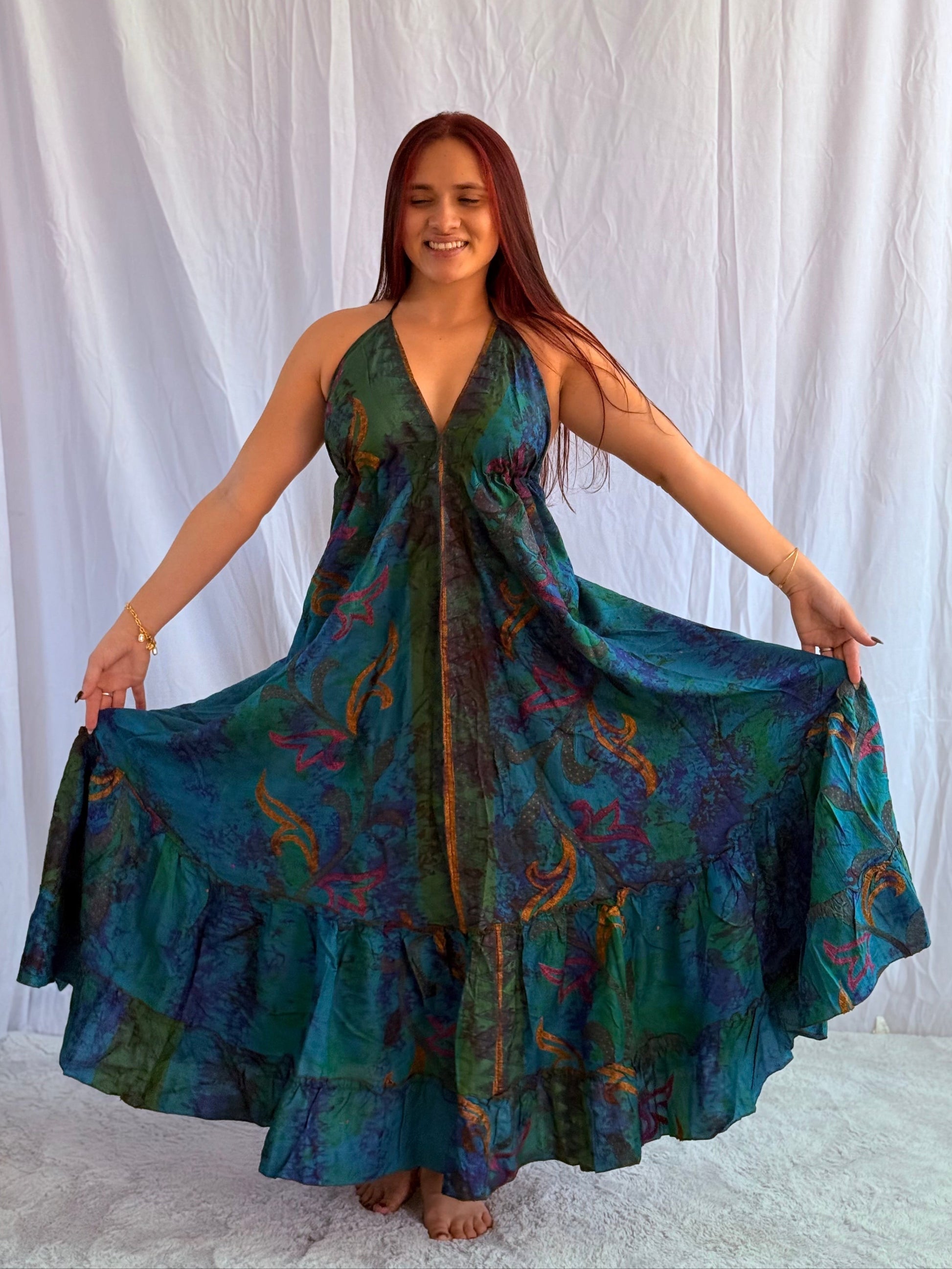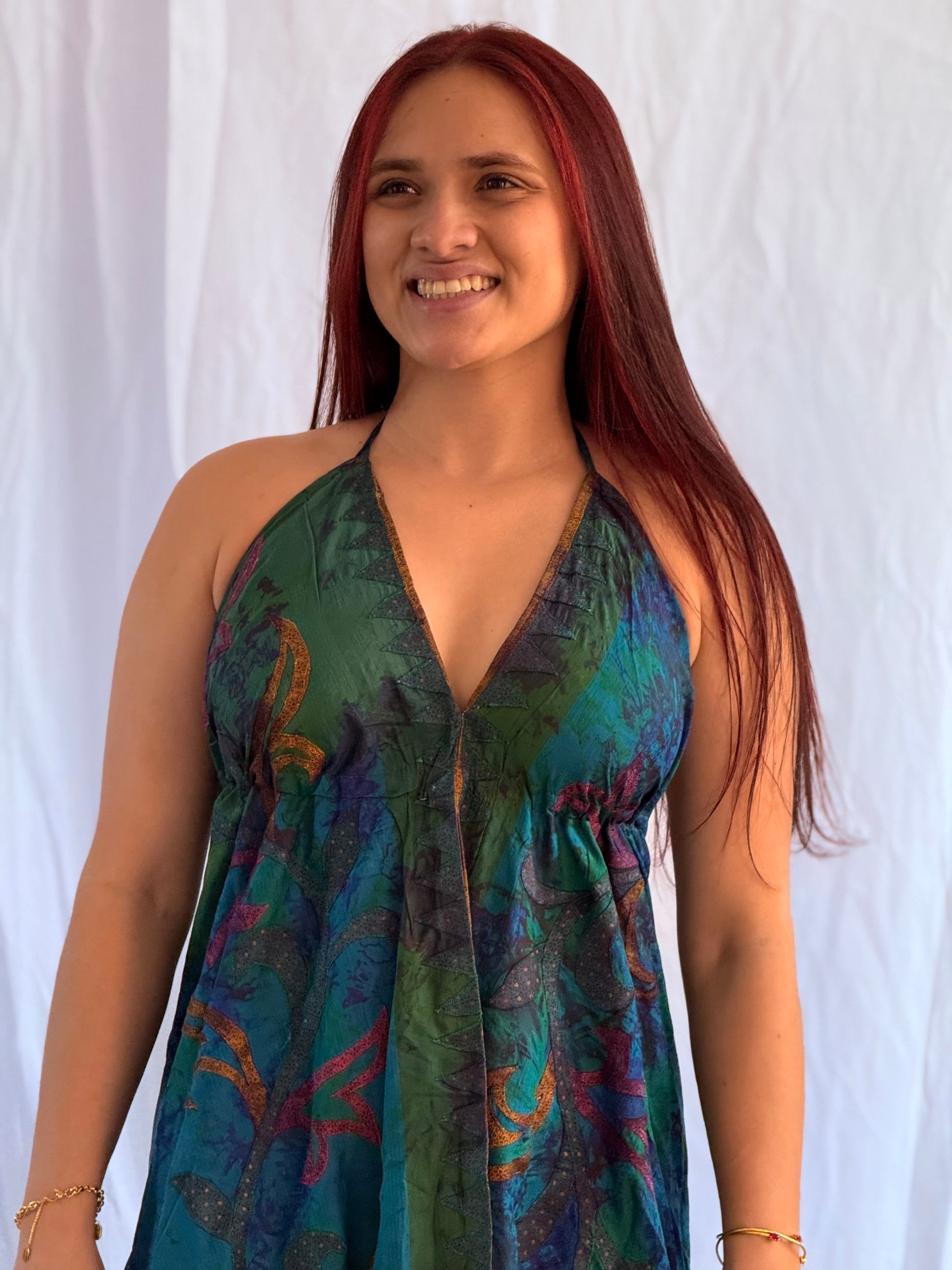 A one-of-a-kind dress full of vibrant colors and energy. Designed with a halter neckline and open back, it enhances the feminine silhouette while offering freshness and comfort. The multicolor print with embroidered details and shiny accents makes it a truly eye-catching and sophisticated piece.