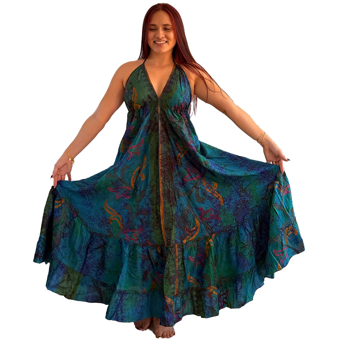 Un vestido único lleno de color y energía. Su diseño con amarre al cuello y espalda descubierta resalta la silueta femenina mientras brinda frescura y comodidad. El estampado multicolor con detalles bordados y apliques brillantes lo convierte en una pieza llamativa y sofisticada.