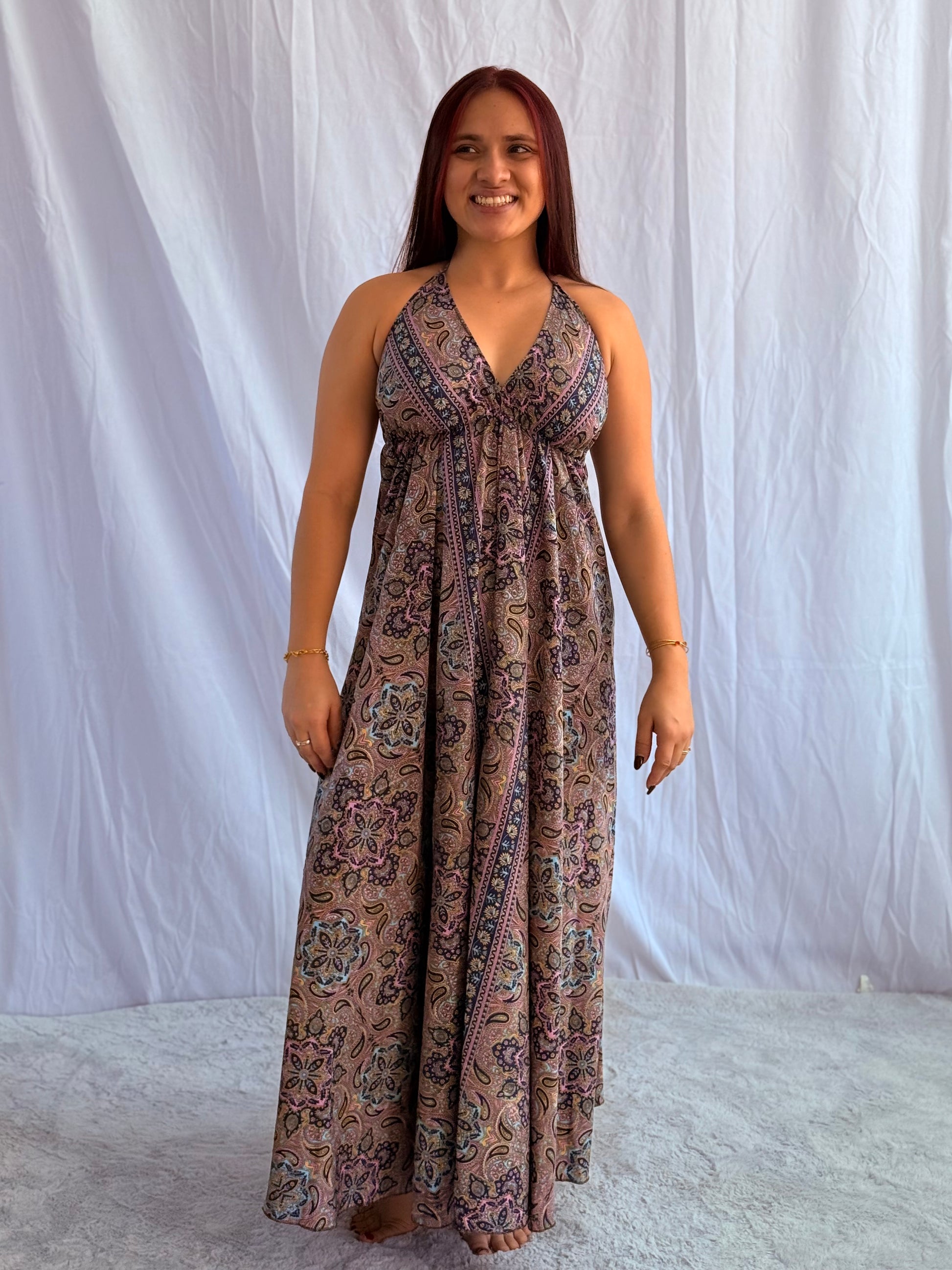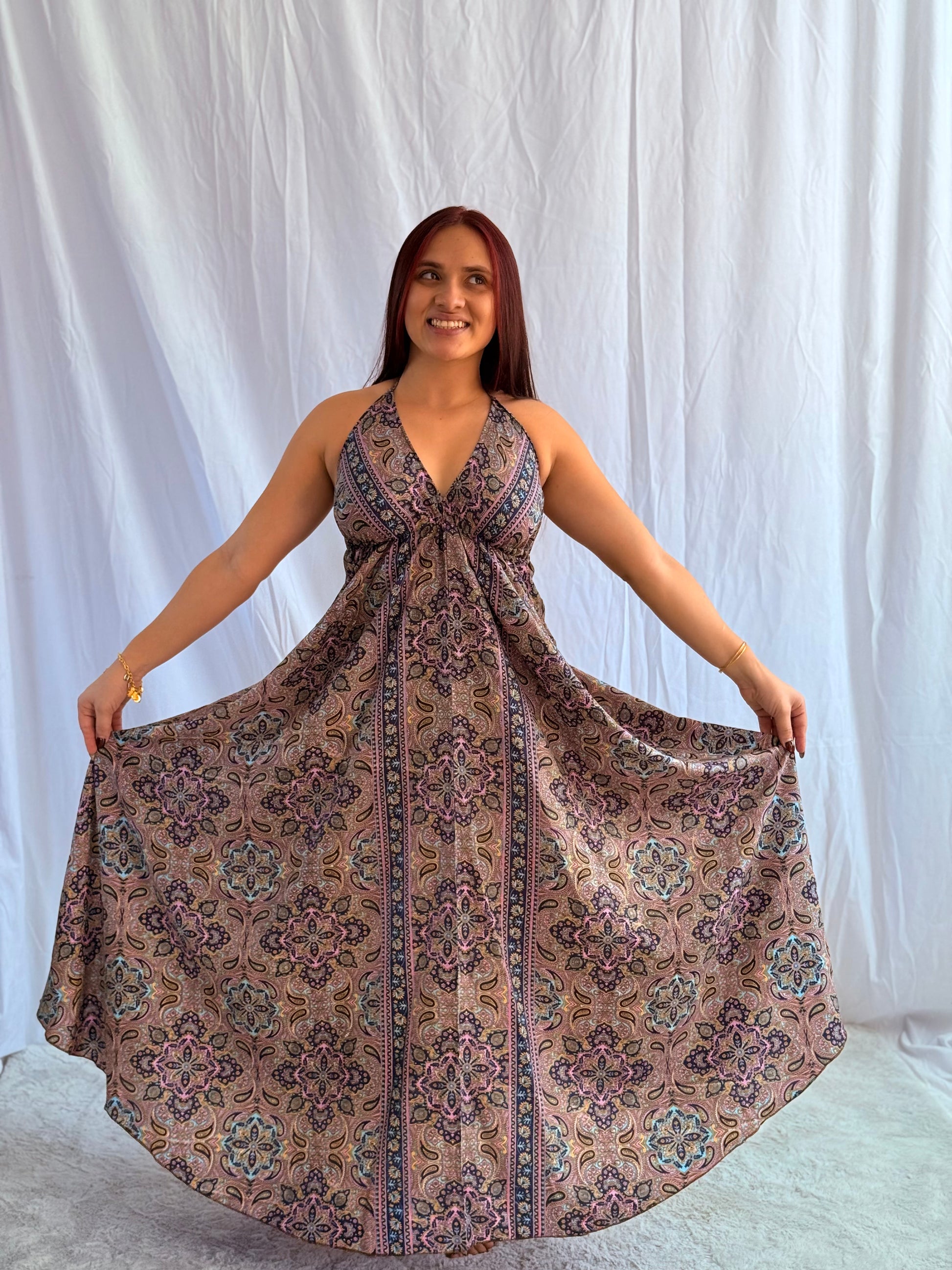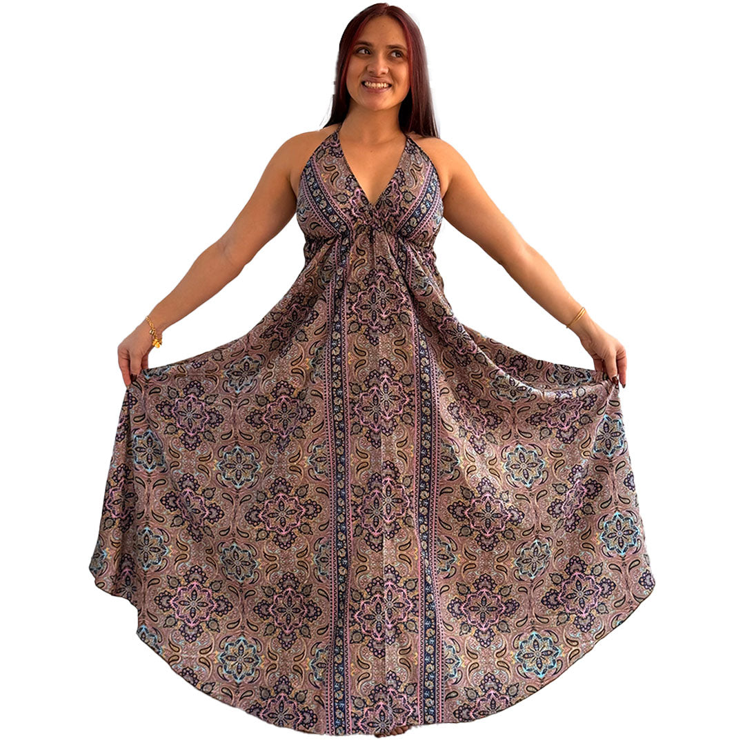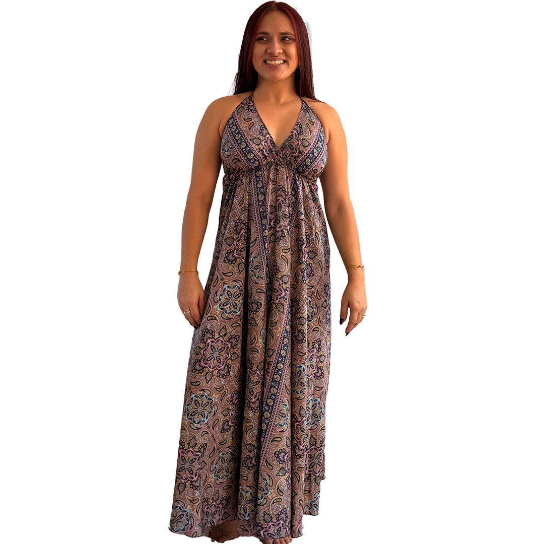 Un vestido único lleno de color y energía. Su diseño con amarre al cuello y espalda descubierta resalta la silueta femenina mientras brinda frescura y comodidad. El estampado multicolor con detalles bordados y apliques brillantes lo convierte en una pieza llamativa y sofisticada.