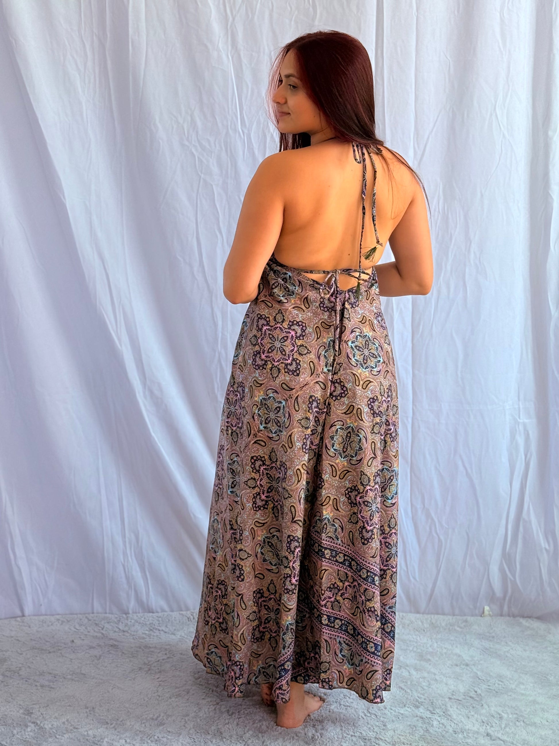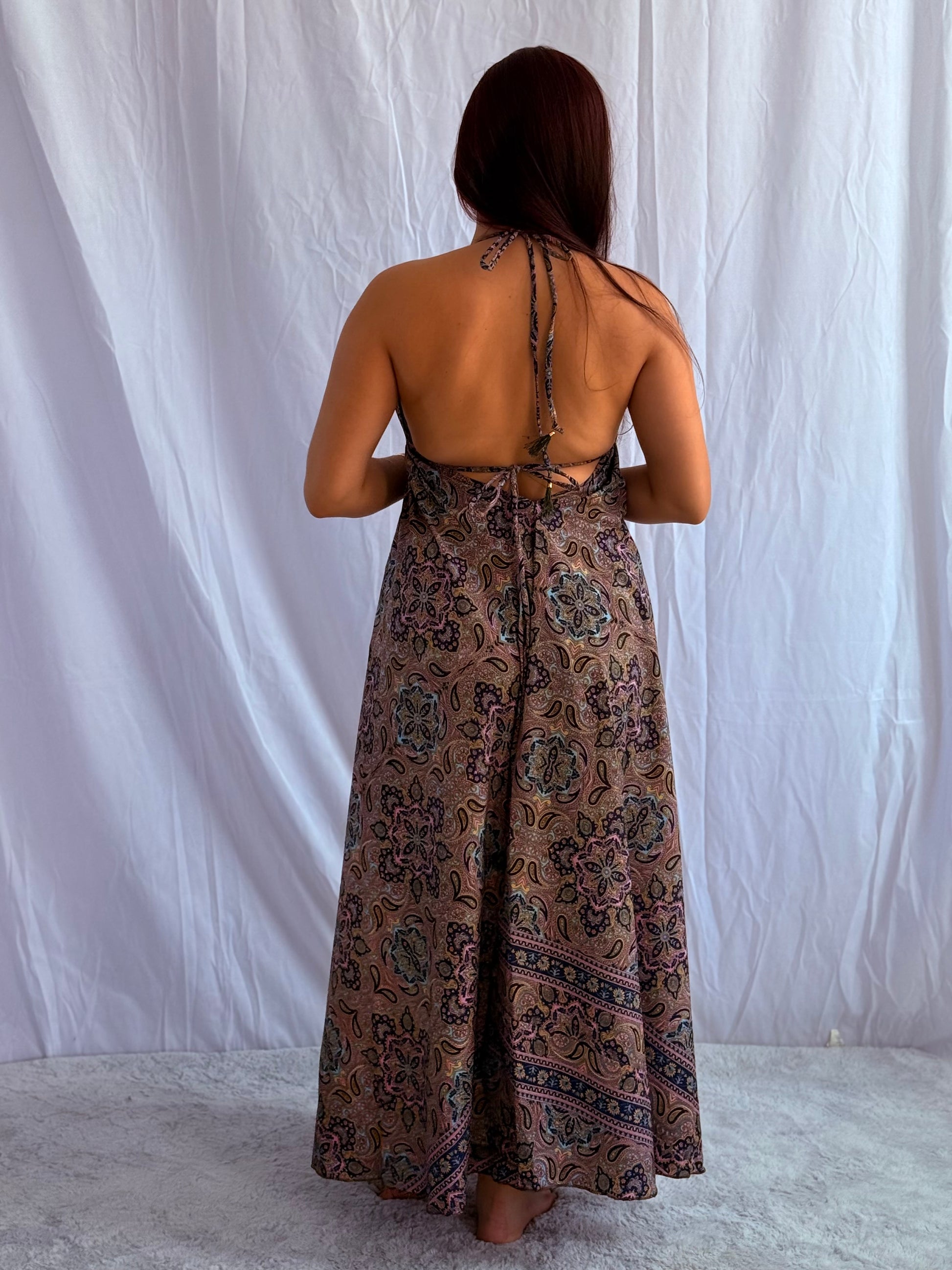 A one-of-a-kind dress full of vibrant colors and energy. Designed with a halter neckline and open back, it enhances the feminine silhouette while offering freshness and comfort. The multicolor print with embroidered details and shiny accents makes it a truly eye-catching and sophisticated piece.