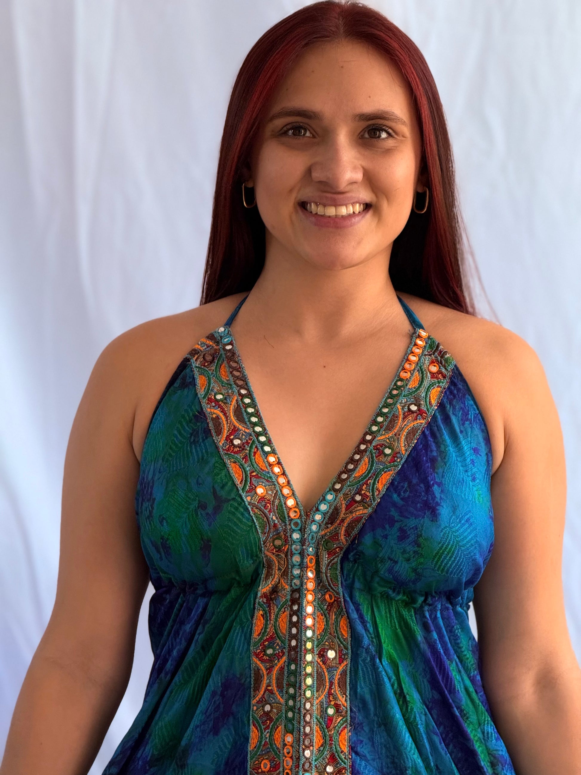 A one-of-a-kind dress full of vibrant colors and energy. Designed with a halter neckline and open back, it enhances the feminine silhouette while offering freshness and comfort. The multicolor print with embroidered details and shiny accents makes it a truly eye-catching and sophisticated piece.