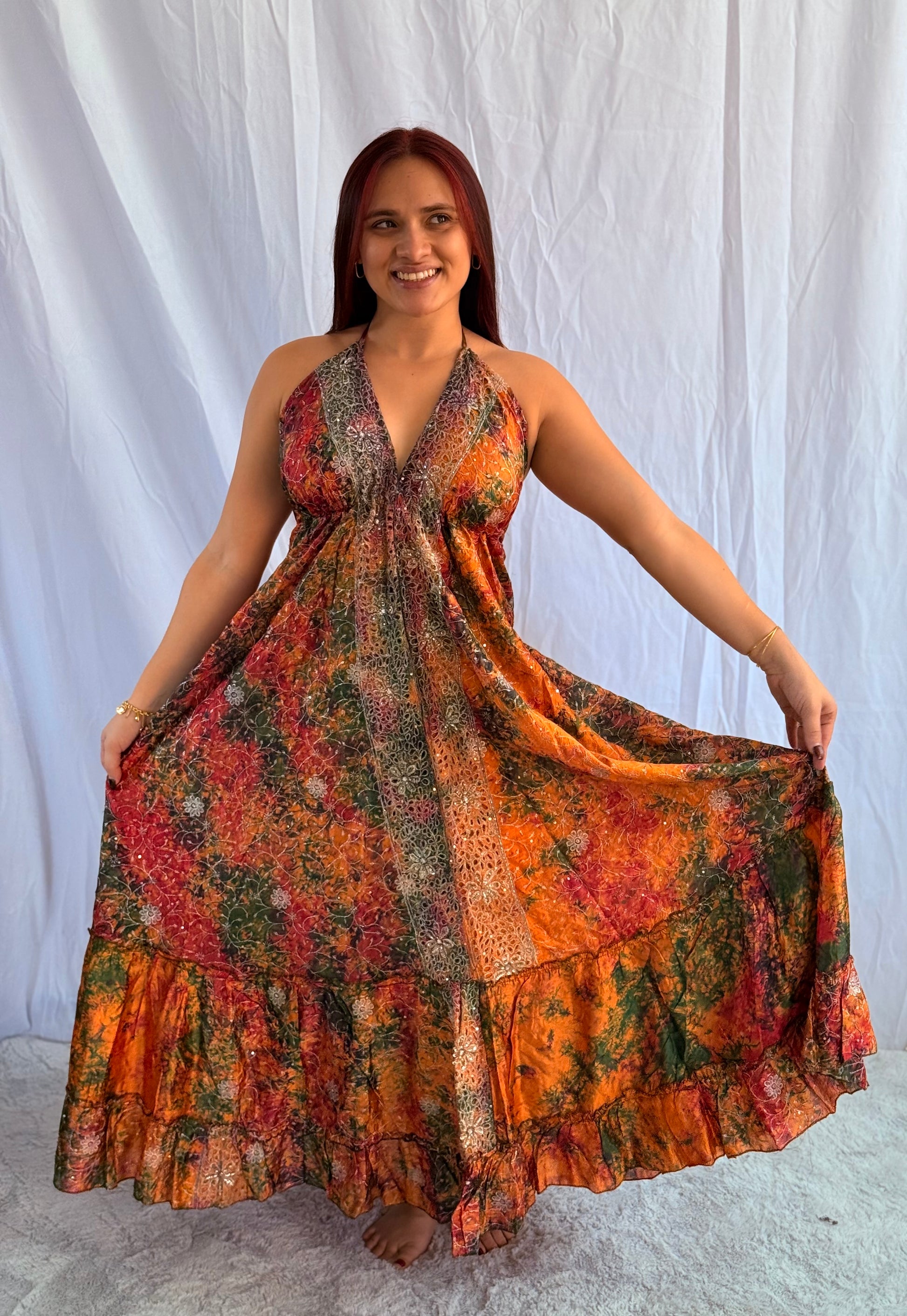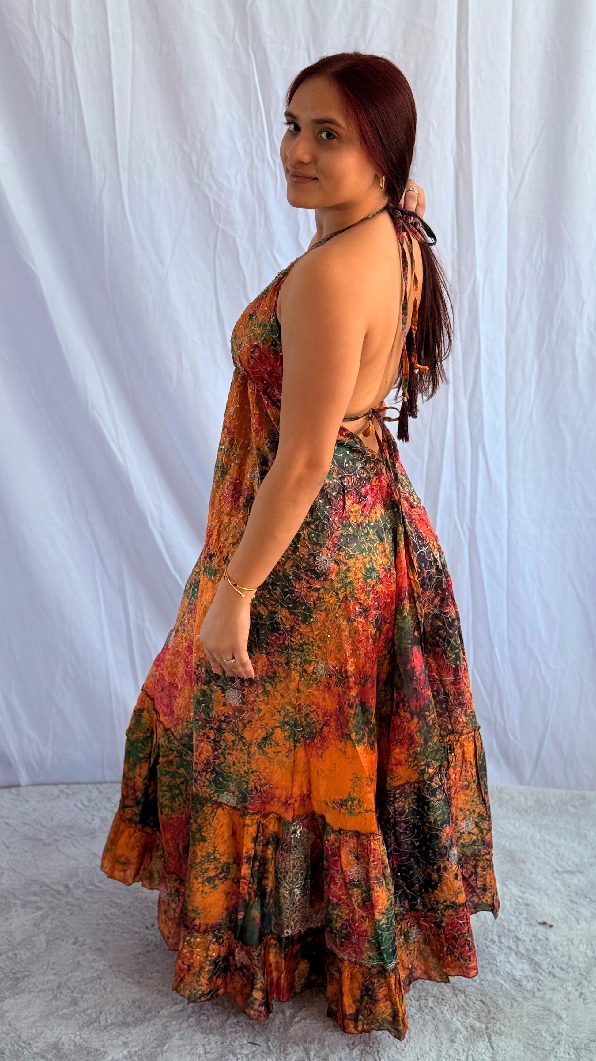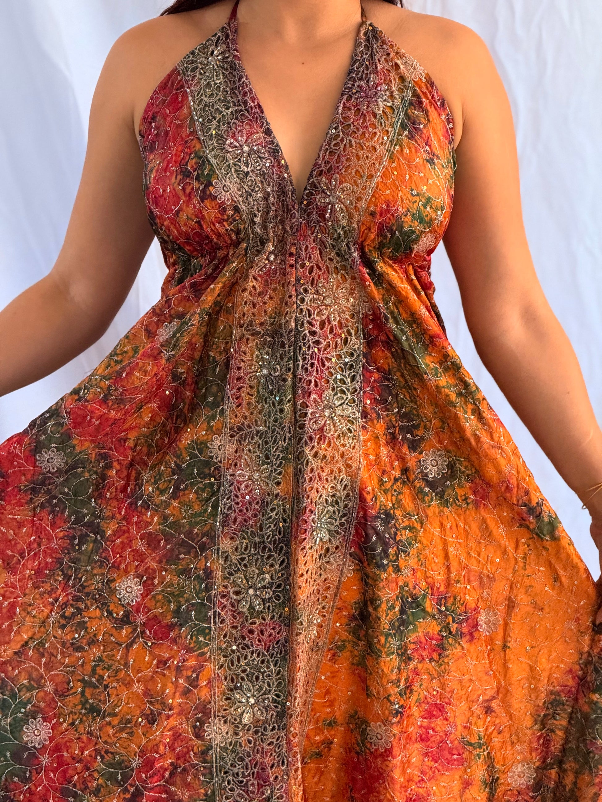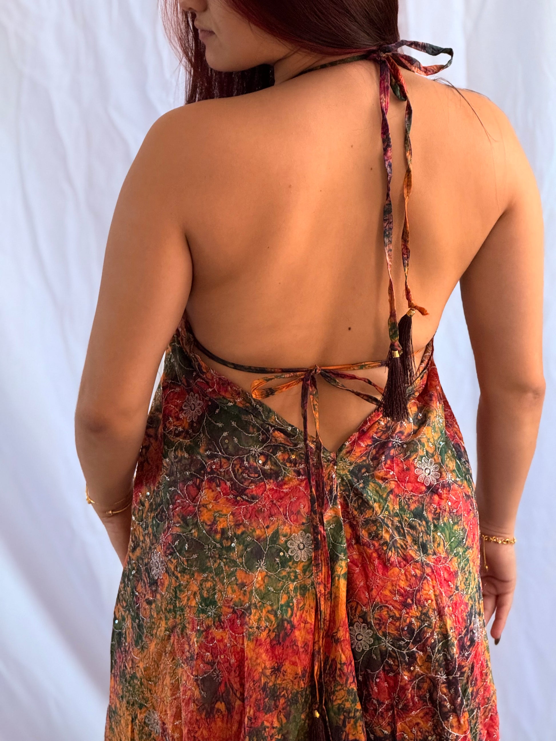 A one-of-a-kind dress full of vibrant colors and energy. Designed with a halter neckline and open back, it enhances the feminine silhouette while offering freshness and comfort. The multicolor print with embroidered details and shiny accents makes it a truly eye-catching and sophisticated piece.
