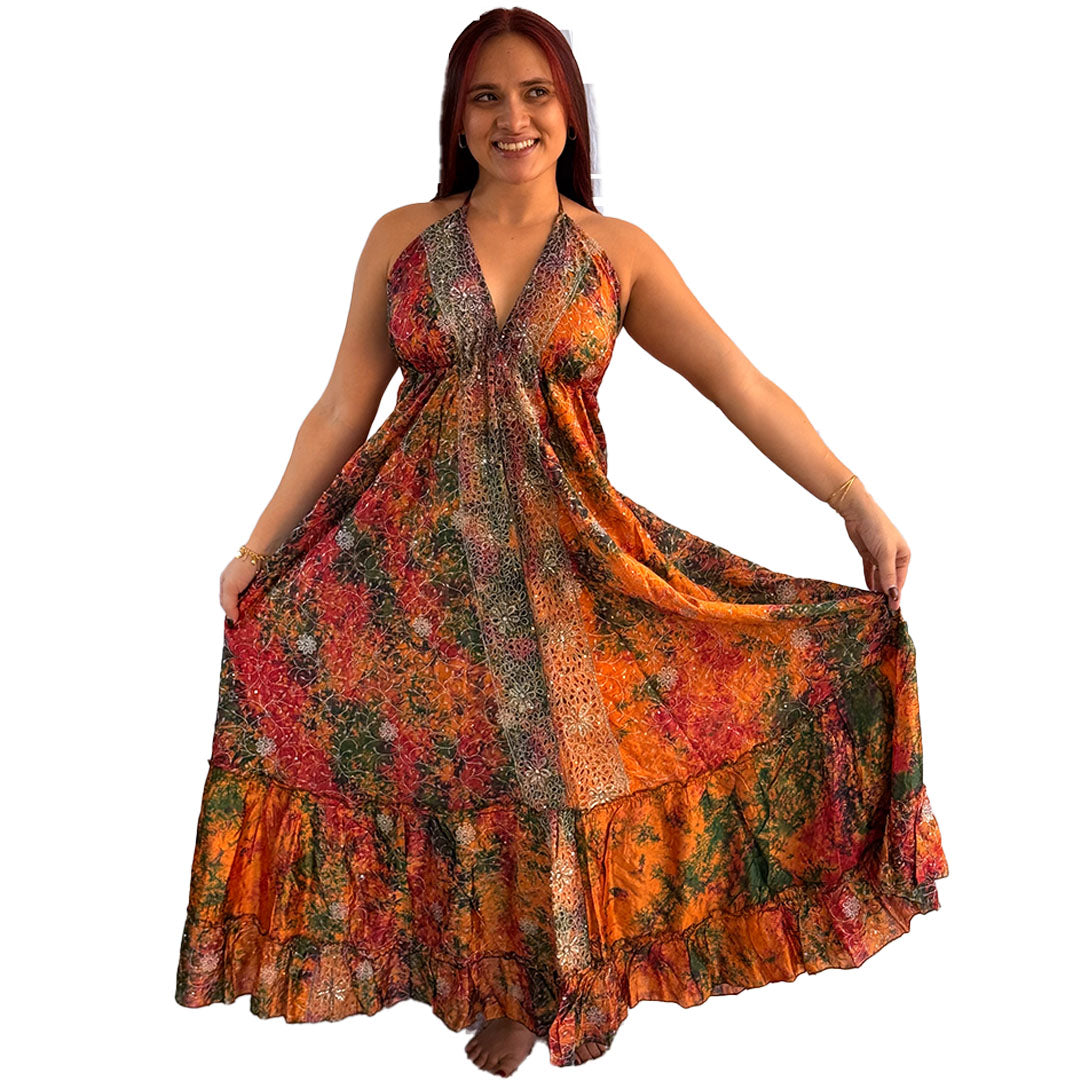 Un vestido único lleno de color y energía. Su diseño con amarre al cuello y espalda descubierta resalta la silueta femenina mientras brinda frescura y comodidad. El estampado multicolor con detalles bordados y apliques brillantes lo convierte en una pieza llamativa y sofisticada.