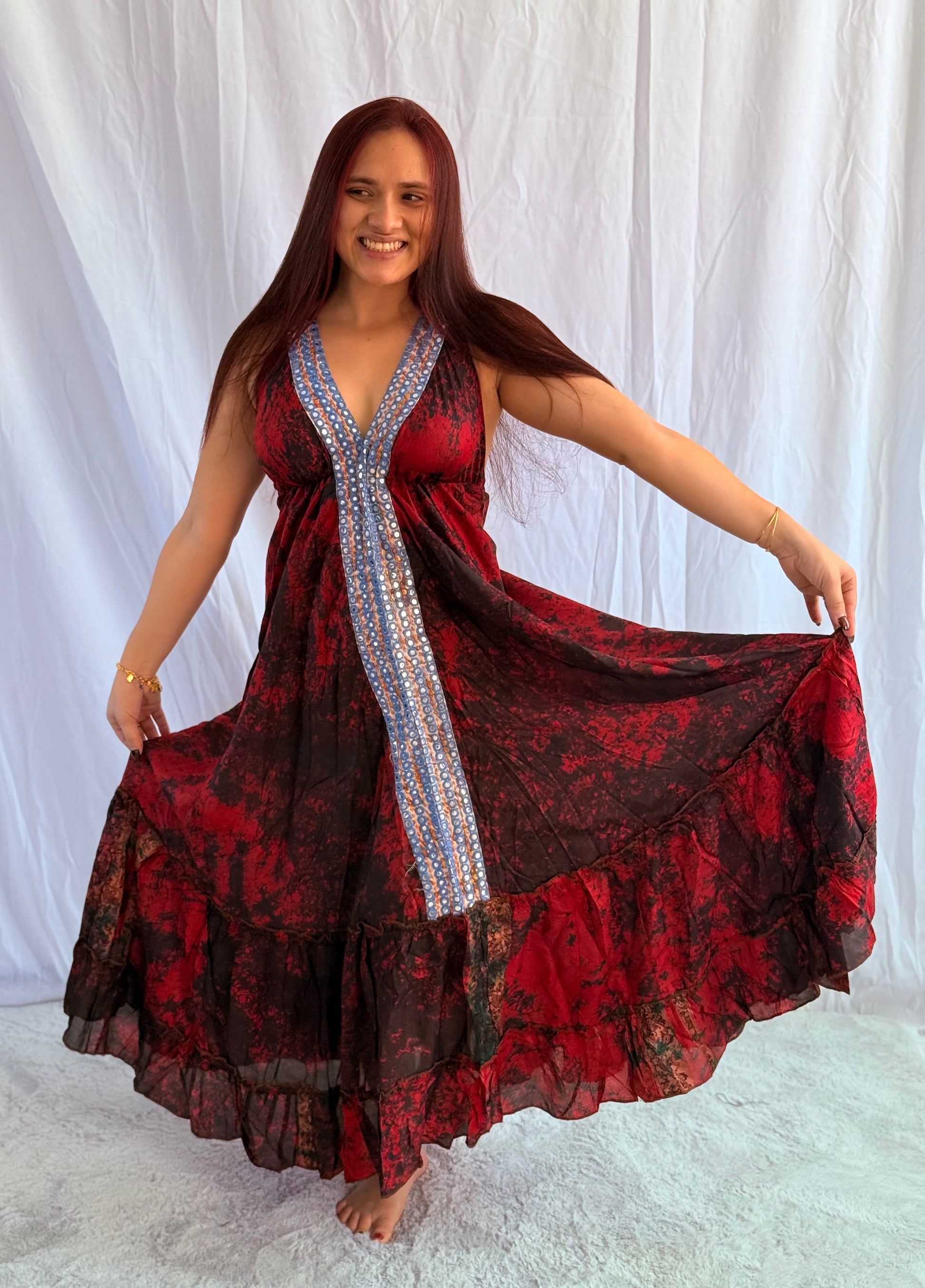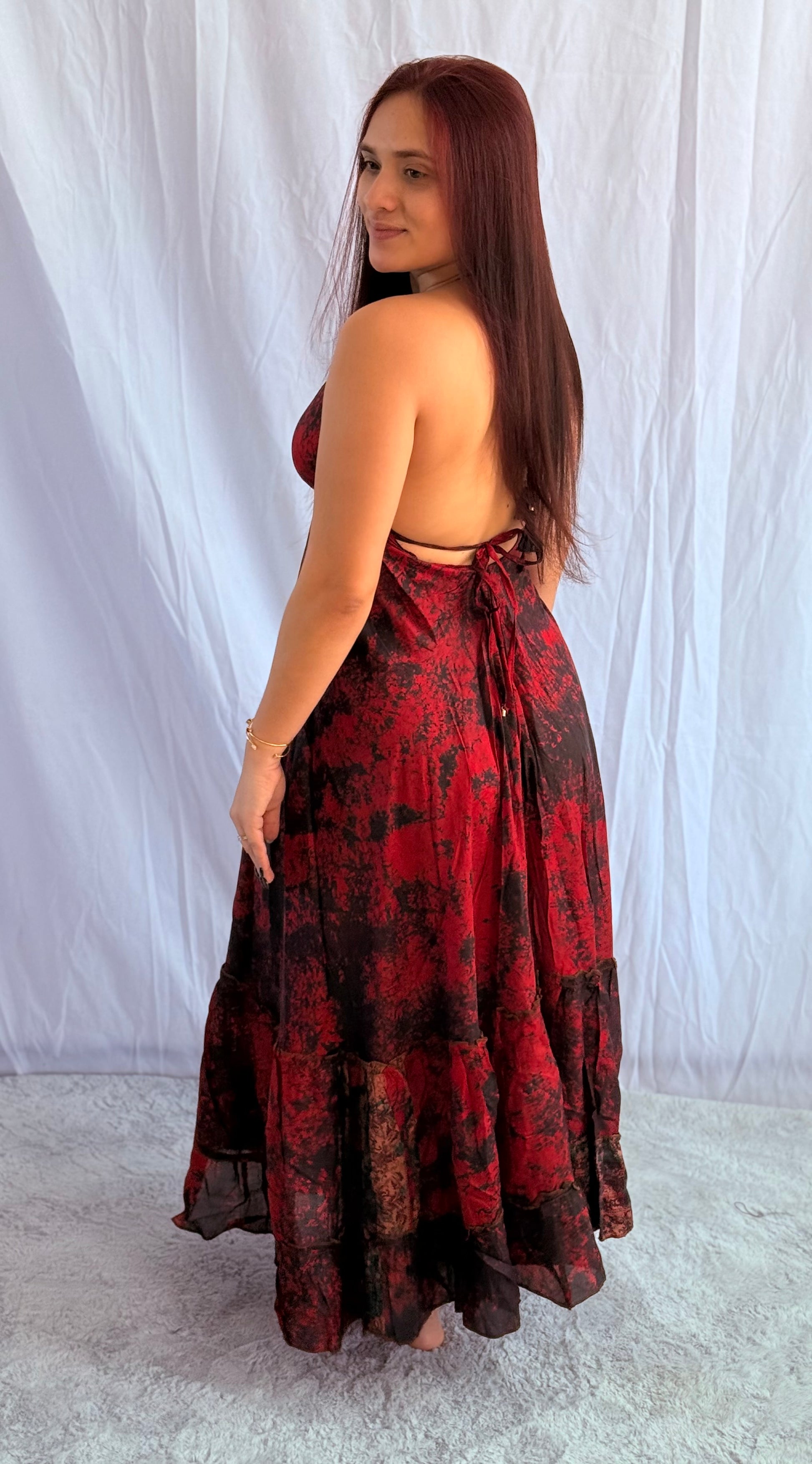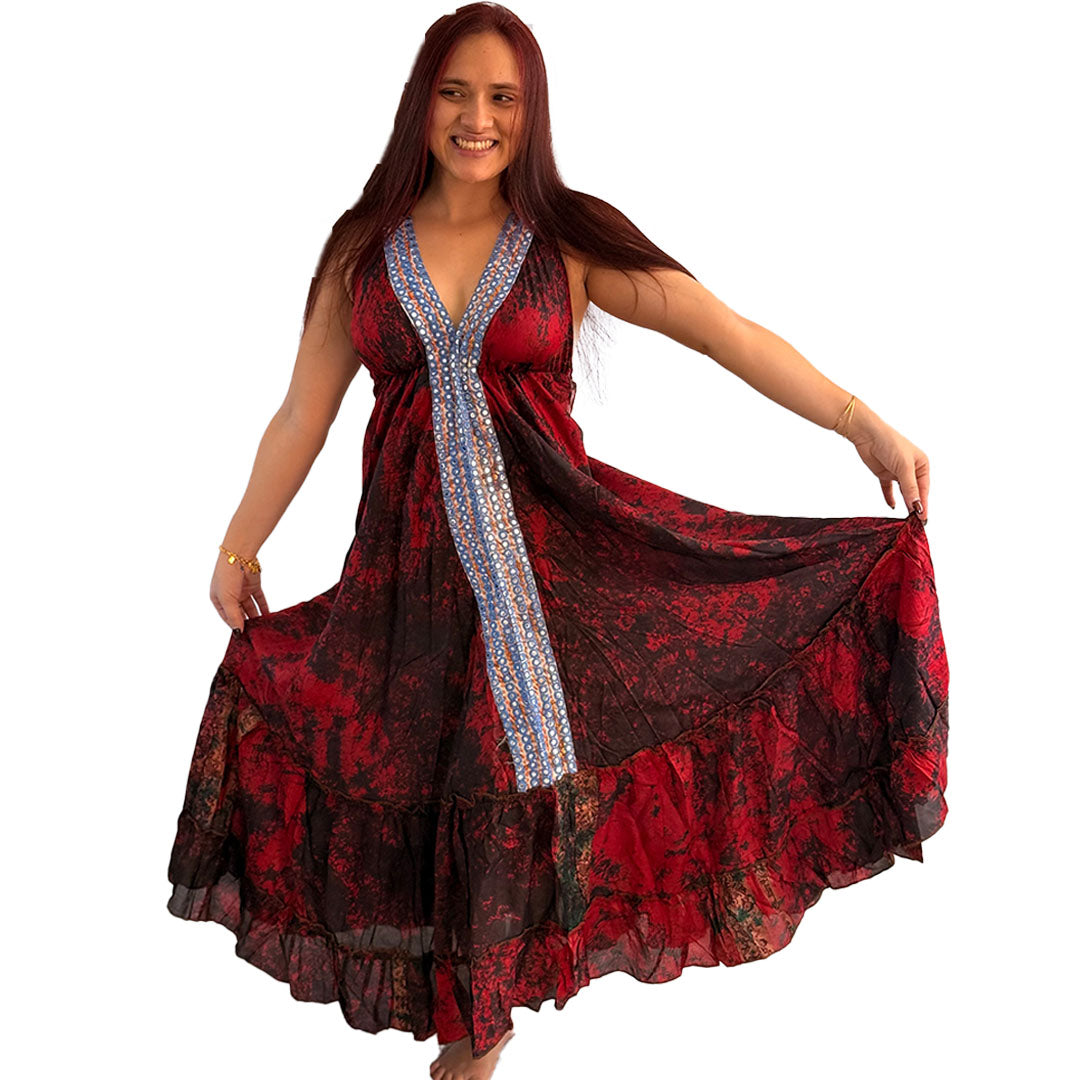 Un vestido único lleno de color y energía. Su diseño con amarre al cuello y espalda descubierta resalta la silueta femenina mientras brinda frescura y comodidad. El estampado multicolor con detalles bordados y apliques brillantes lo convierte en una pieza llamativa y sofisticada.